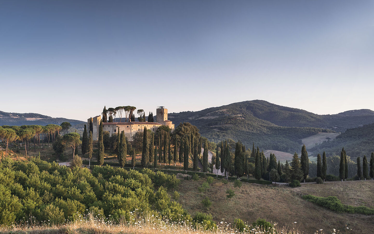 Inmitten der weiten Hügellandschaft zwischen Umbrien und Toskana verzaubert dieses mittelalterliche Schloss auch den anspruchsvollsten Gast. Der Außenpool wirkt wie eine schimmernde optische Täuschung, der alte Weinkeller wurde in ein verträumtes Badehaus verwandelt, in dem man erstklassige Behandlungen genießt. Im ältesten Gemäuer ist die Turm-Suite untergebracht – auf fünf Etagen und mit spektakulärer Terrasse.