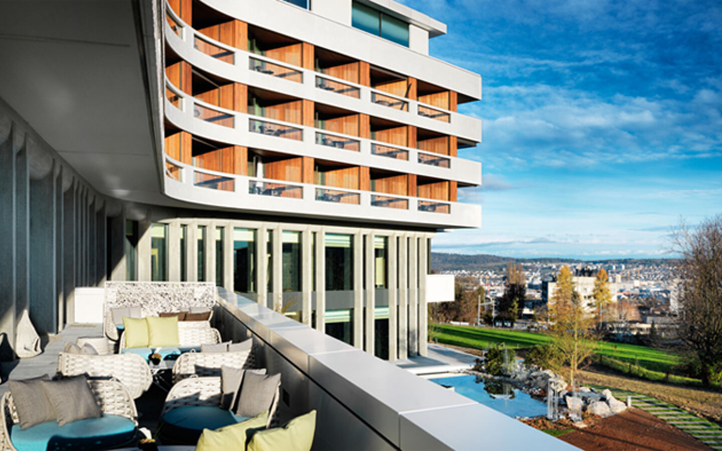 Wie ein Ypsilon liegt es am Hang. Der bedeutende, heute teilweise unter Denkmalschutz stehende Bau aus der Nachkriegszeit, wurde entkernt und vollständig renoviert. Als neues Urban Retreat ist es ein luxuriöser Rückzugsort zwischen Natur und Stadt, in Reichweite zu Zürichs Zentrum mit seinen kulturellen Highlights und Weltklasse-Boutiquen.
