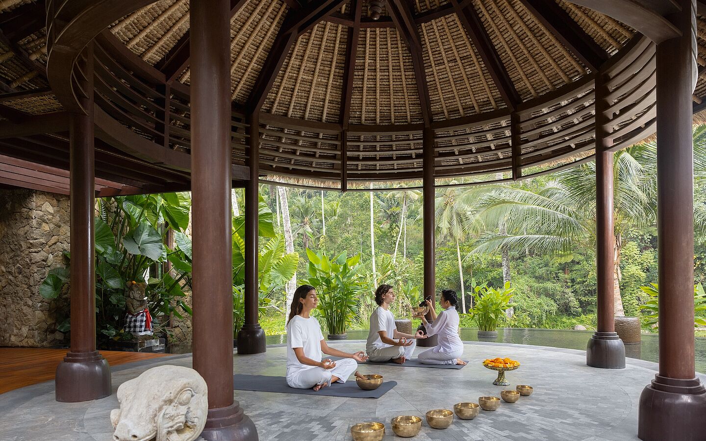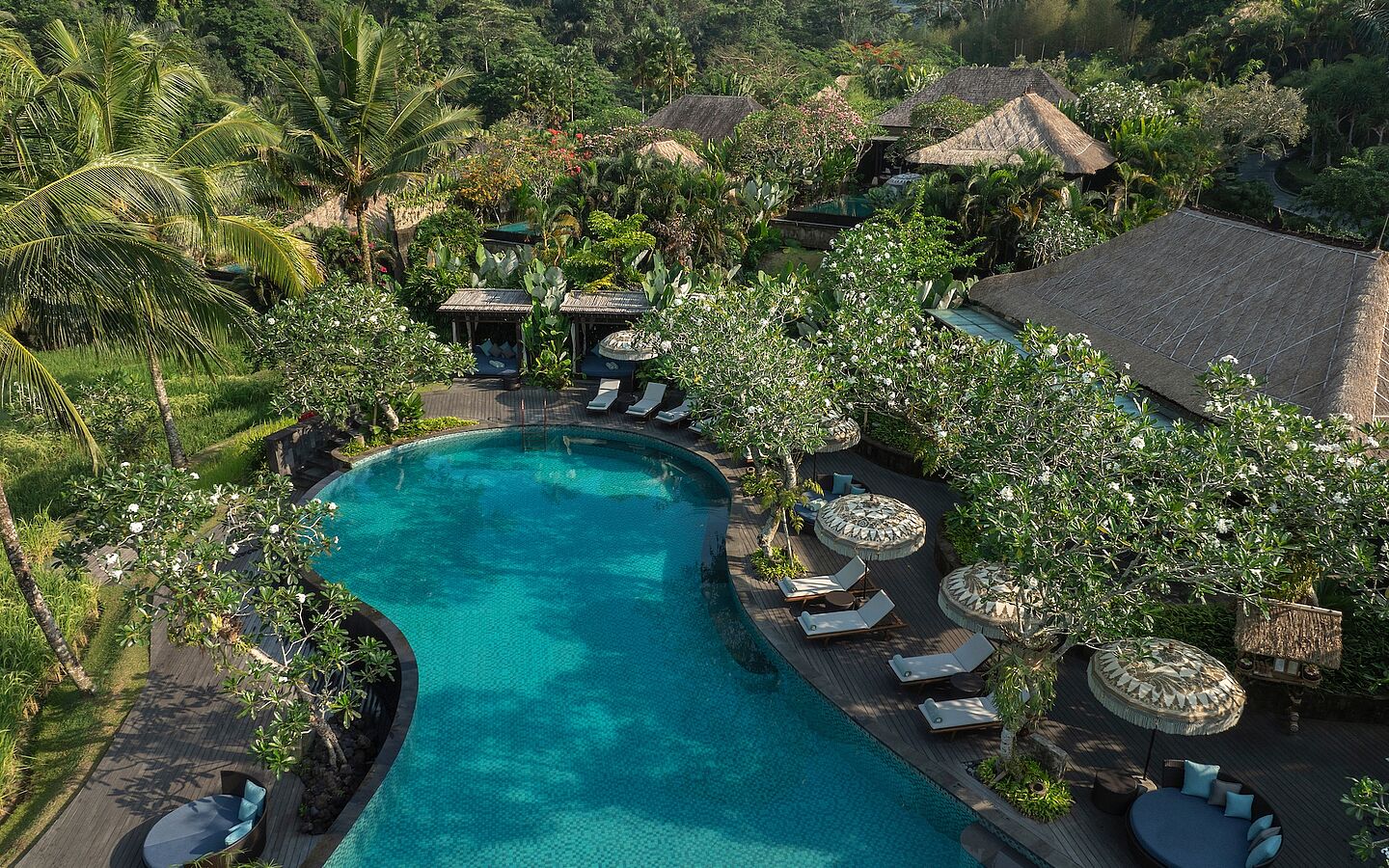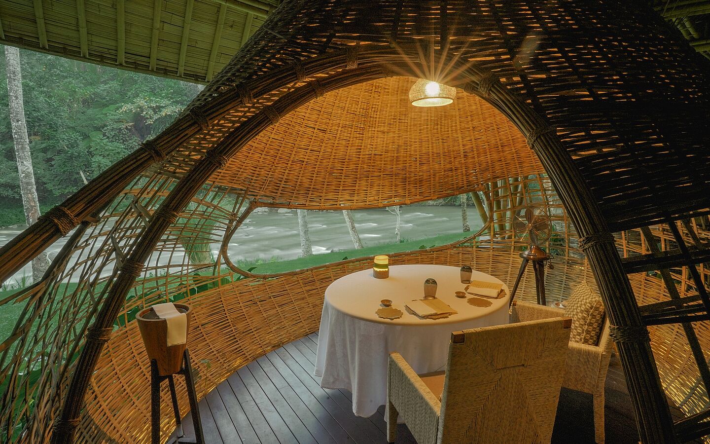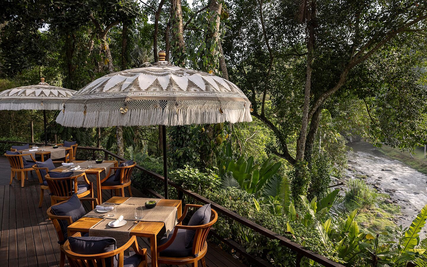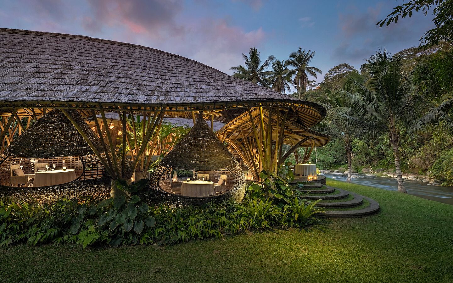 Idyllically located on the banks of the Ayung River, this holistic retreat features luxurious suites and pool villas. The grounds extend across rice fields and forests with many romantic seating areas for private picnics. The Kubu restaurant offers an intimate fine dining experience in private bamboo cocoons in beautiful surroundings. For an aperitif, we recommend the Ambar Ubud Bar, perched high on a cliff with live music. Another highlight is the wellness program, which combines Balinese healing traditions with modern luxury. Nearby attractions include the Ubud Palace, art galleries, and the traditional market. Adventurous guests can explore the river by rafting or climb Mount Batur at sunrise. Exciting full-day programs are offered for children at Mandapa Camp.