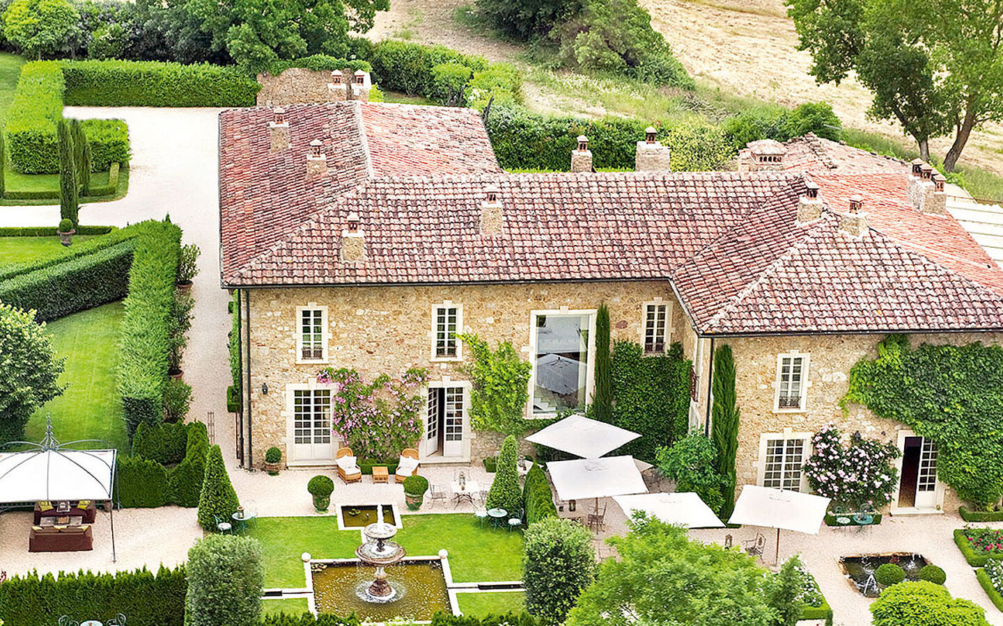 Lively 1930s jazz drifts through the wide-open double doors of the Tuscan manor house. In the garden, the sun is just sending its last, weak rays over the stone balustrade and bathing the citrus trees on the lawn in front of the veranda in golden light. There's a spicy Mediterranean scent of lavender, rosemary and immortelle. In my hand is a glass of sparkling wine, at my feet the green, gently undulating forests of the Valle Serena. I arrived at the luxury hideaway Borgo Santo Pietro less than an hour ago, but I already have an inkling of why this corner of the world is known as the "Valley of Tranquillity". There is a time-forgotten magic about it. The villa, the garden and the fantastic natural scenery all around - everything looks as if it has always been there. But the impression is deceptive. When Jeanette and Claus Thottrup discovered the country estate, located around 35 kilometers south of Siena, almost two decades ago, it was still in a completely desolate state. The only remaining visitors: a flock of pigeons - despite the fact that the history of hospitality in this stone house can be traced back to the 13th century. Thanks to extensive restoration work carried out over many years by the Danish entrepreneurial couple with a keen sense for historic buildings and Italian garden architecture, the estate, including its 13-hectare garden and the accompanying 93-hectare organic farm, now shines in its former glory. For connoisseurs of Italy, Borgo Santo Pietro has become the epitome of "dolce vita" and "benessere" in Tuscany.