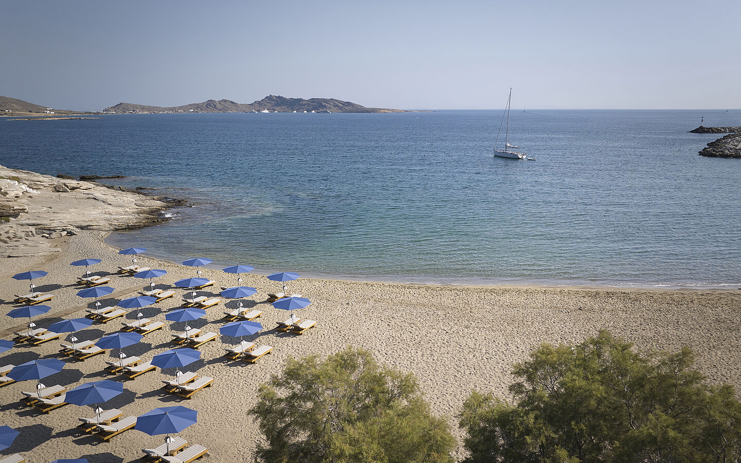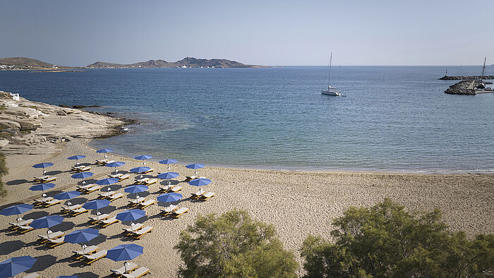 Direkt am Strand und dennoch stadtnah hat das Avant Mar das, was Makler glücklich macht: Lage, Lage, Lage. Die Gäste sollen sich wie Einheimische in der hübschen Hafenstadt fühlen, Teil der Nachbarschaft sein. Und das gelingt. Ruhig ist es am Plungepool unserer Suite mit seitlichem Meerblick. Etwas lebendiger geht es am Gemeinschaftspool mit dick gepolsterten Sunbeds zu. Ein paar Schritte wären es stattdessen zum Strand in einer kleinen Bucht, bestuhlt vom Hotel. Dass sich das quirlige Zentrum von Naoussa nicht einmal zehn Laufminuten entfernt befindet, ist kaum zu glauben. Man hört davon nichts. Vielmehr genießt man jede Menge Privatsphäre und Boutique-Hotel-Charme, wie er sein sollte. Überall blüht und duftet es: Minze und Rosmarin, Oleander und Bougainvillea, Oliven- und Granatapfelbäume – ein sehr gepflegter, mediterraner Garten trägt zum Wohlfühlen bei. Thyms, also Thymian, heißt das Restaurant, ebenfalls ein sehr entspannter Ort in sanften, hellen Naturtönen, haptisch schönen Materialien (das gilt auch für die Suiten) und einer zeitgenössischen griechischen Küche, die vom Frühstück – Buffet plus à la carte; einige Gerichte müssen extra bezahlt werden – bis zu den köstlichen Mezes mittags und abends zu überzeugen weiß. So sehr, dass es eigentlich kein zweites Restaurant bräuchte. Doch in der Hochsaison öffnet eine Dependance des Nobu und verdoppelt das kulinarische Vergnügen. „Steki“ ist das hübsche, griechische Wort für „Lieblingsplatz“. Davon gibt es gleich mehrere, so die erhöht gelegene Bar namens The Bridge unter freiem Himmel. Mit Blick auf Naoussa und das Meer fühlen wir uns dem griechischen Götterhimmel hier sehr nah.