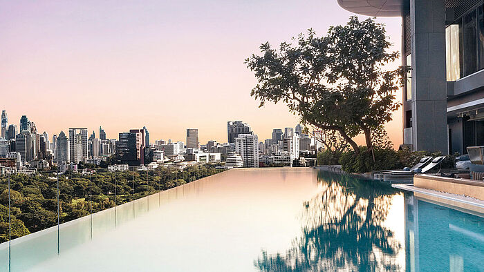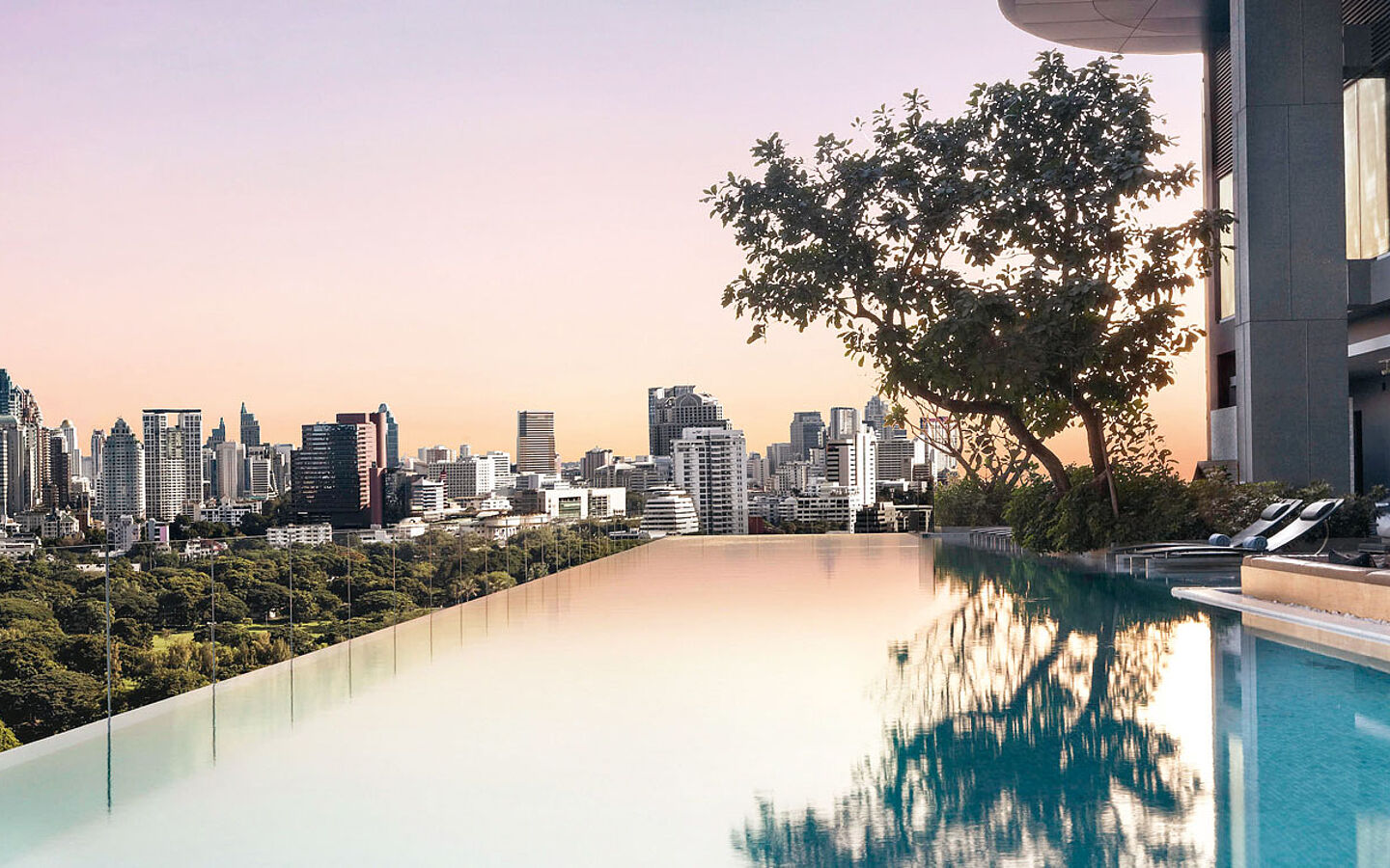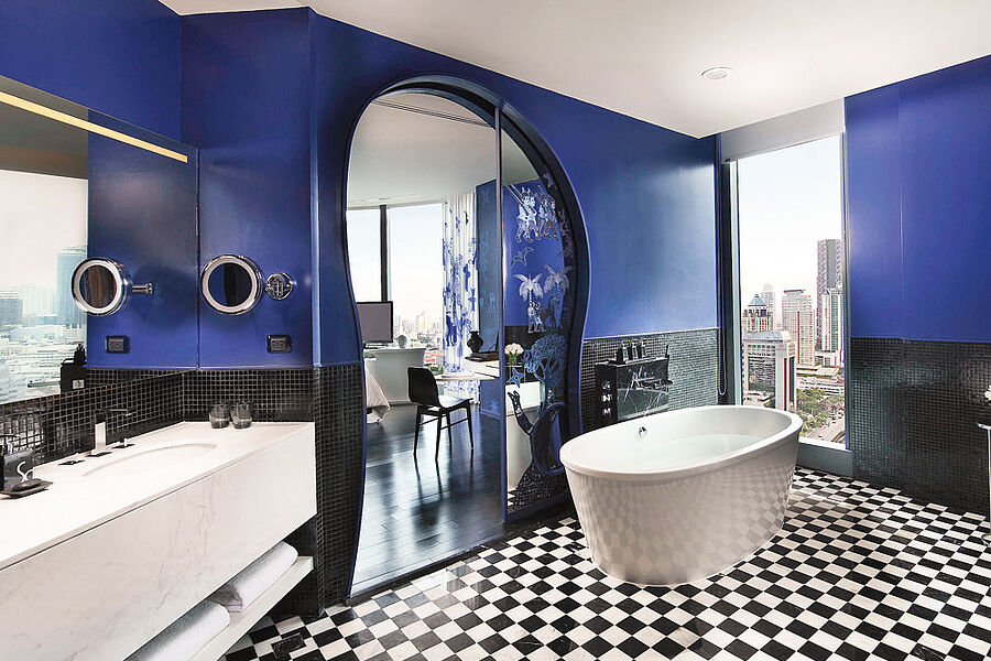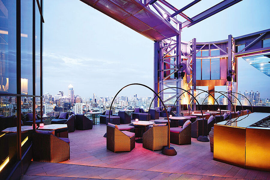 Im extravaganten Ambiente hat man das Gefühl, bei Christian Lacroix zu Hause zu sein: Hier tragen Modepuppen elegante Kollektionsentwürfe und die fantasievoll gestalteten Wände präsentieren sich als eklektisches Zusammenspiel aus Bildern und Motiven des alten Siam und Frankreich. Dazu kommen bunte Sessel in Rosa, Orange, Lila, Blau, mit Leder bezogene Tische, kunstvoll designte Teppiche – und ein exzellenter Service: Vom leckeren Frühstück bis in den Abend hinein wird man mit Snacks, Nachmittagstee, Drinks und Cocktails bestens versorgt. Das Pooldeck mit grandiosem Ausblick ist stets gut besucht. Nachteil: zu wenig freie Liegen. Wie es sich für Bangkoks luxuriöse Cityhotels gehört, bietet das SO Sofitel natürlich auch eine Dachterrasse mit Bar und Restaurant, die abends zum „Place to be“ werden.