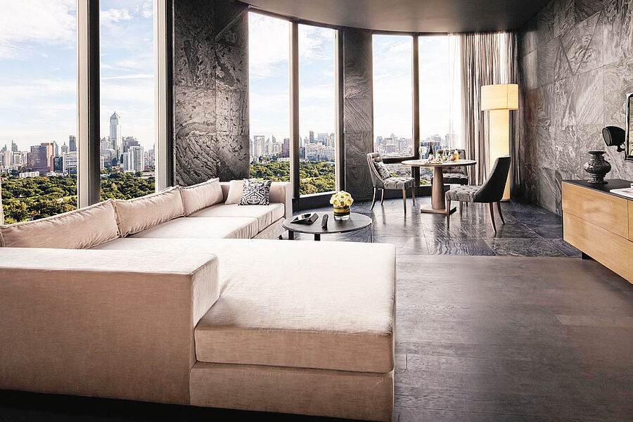 Das Lifestyle-Boutique-Hotel liegt direkt gegenüber vom Lumphini Park. Dazwischen verläuft eine der großen Hauptverkehrsadern, die Sathorn Road, deren Dauer-Verkehr sich leider nicht immer ausblenden lässt. Das Interieur der 238 Zimmer und Suiten ist von den fünf Elementen inspiriert. Angenehm sind die superbreiten Betten, bodentiefen Fenster, die kostenfreie Nutzung der Minibar, Espressomaschine mit Illy Kapseln, Laptop-Safe, sowie neueste Technologie mit Apple-Mac-Mini-Multimediasystem. Besonders zu empfehlen: die SO Club Zimmer mit Zugang zur stylishen Signature Club Lounge in der 25. Etage.