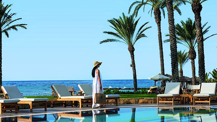 There are plenty of other new features at this adults-only hotel: In the redesigned and expanded VIP’S Bar , you can enjoy your evening cocktail; the St. Andrew’s Rooftop Bar is now on the upper floor and offers a panoramic view of sunsets. Down below, between the pools, another bar awaits in the garden; the former Lounge Bar will serve as a stage for shows and entertainment several times a week. The Estia Restaurant has been modernized, while the Mediterranean and international cuisine remains top-notch, without any fuss. The beach is right in front of the hotel, the sun loungers are made of wood, and private cabanas are available. The garden offers plenty of space; no one gets in anyone else’s way. Paphos itself is within easy reach—the picturesque harbor and the upper town with its restaurants invite you to stroll and linger.