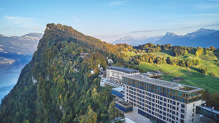 From the shores of Lake Lucerne, a cogwheel train travels steeply upwards, straight along the rock faces. No luxury hotel in the traditional sense awaits its guests at the top - rather a cosmos of the good life: