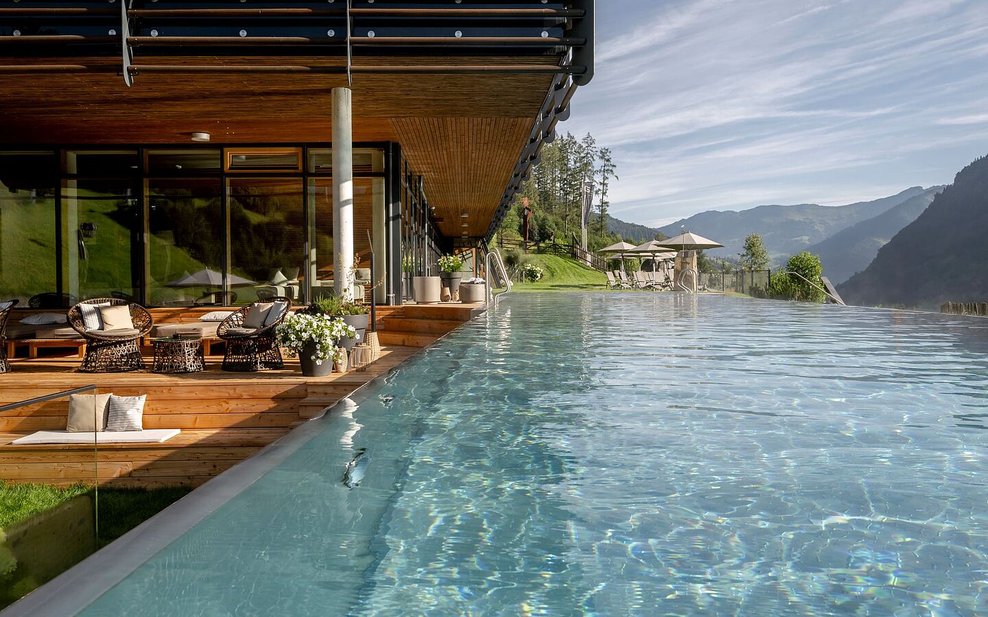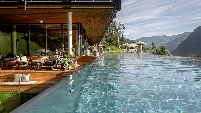 Für pure Entspannung sorgt der erweiterte Spa-Bereich Nature’s Nest, der seit Sommer 2024 einige Neuerungen bietet. Ein erfrischendes Kaltwasserbecken mit Wasserfall, ein innovatives Schaum-Dampfbad oder der Whirlpool im Außenbereich schaffen einzigartige Momente der Erholung. Auch kulinarisch setzt DAS.GOLDBERG neue Akzente. In einem Ambiente, das durch natürliche Materialien wie Holz und Leinen besticht, können Gäste regionale wie auch nachhaltige Köstlichkeiten genießen. Heimische Pflanzen, die sich an Metallstangen emporranken, schaffen ein harmonisches Zusammenspiel von Innen- und Außenbereich und unterstreichen die Philosophie des Hauses: Im Einklang mit der Natur. Der Barbereich des Hotels erstrahlt in einem neuen, goldenen Glanz, der durch eine Bartheke aus heimischer Eiche ergänzt wird. Hier lässt sich der Tag in einem besonders stimmungsvollen Ambiente ausklingen. DAS.GOLDBERG ist mehr als nur ein Hotel, es ist ein Rückzugsort, der Gästen eine Auszeit fernab vom Alltag verspricht.
