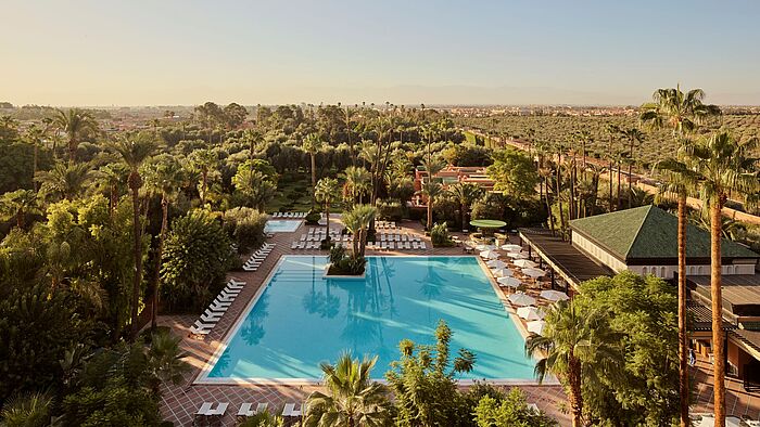 Between palm groves and the ancient walls of Marrakech , La Mamounia transports you into a universe of sensuality, history and perfect hospitality. Time seems to flow unconventionally here - carried by the scent of blossoming orange trees, the shimmering of bougainvillea and the sonorous echo of past centuries. It is not for nothing that this iconic hotel has been one of the absolute grandees of Moroccan luxury hotels for a century - and yet it always remains open to the quiet, modern nuances of a stylish lifestyle. The atmosphere is revealed as soon as you enter: mosaic-decorated halls and elegant salons lead to light-flooded rooms, suites and riads, whose interiors showcase the artful interplay of exotic materials and authentic craftsmanship. Oriental patterns, fine fabrics and warm colors blend with contemporary elegance - creating a harmony of tradition and modernity. The cuisine at La Mamounia is a journey for the senses. The restaurants - including