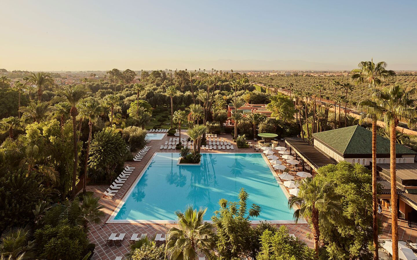 inspired by Moroccan culture and its holistic healing methods. The extensive garden with its pavilions, water features and ancient palm trees rounds off the experience and creates a place of peace and beauty in the middle of the bustling city.