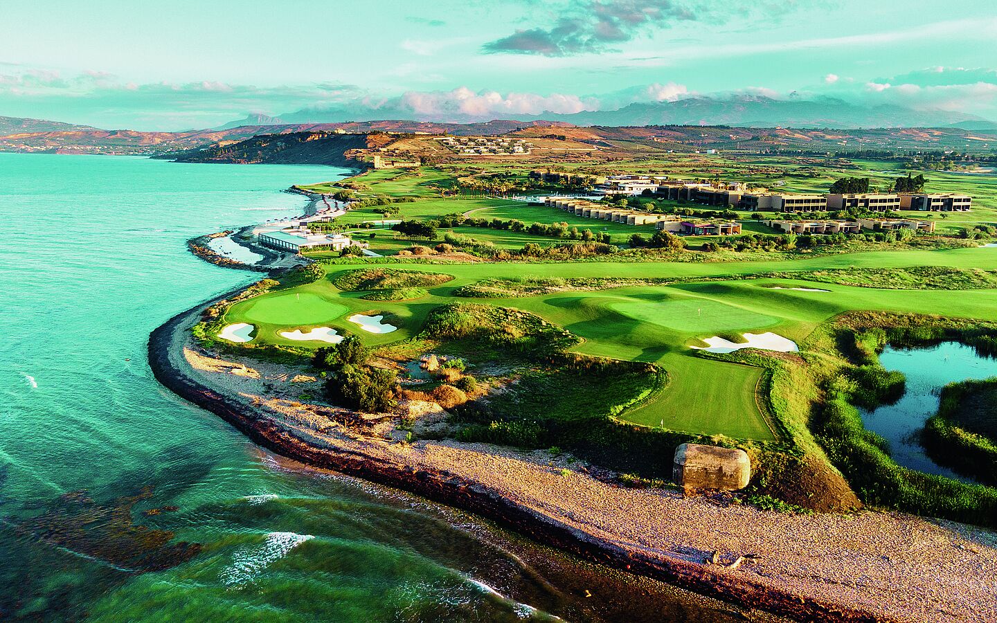 A central theme of the resort is longevity—not as a buzzword, but as a defined program. The starting point is the scientifically documented “Blue Zone” in the nearby Sicani Mountains, particularly in the village of Caltabellotta, about 22 kilometers from the resort. In cooperation with researchers, studies have been conducted over the years to investigate why the local population exhibits remarkably high vitality and life expectancy. Verdura incorporates these scientific findings and translates them into a structured longevity program. At the same time, Verdura positions itself as a golf destination: two 18-hole courses and a 9-hole par-3 course form the sporting center. The courses—East Links and West Shore—have been redesigned and optimized along the coastline.