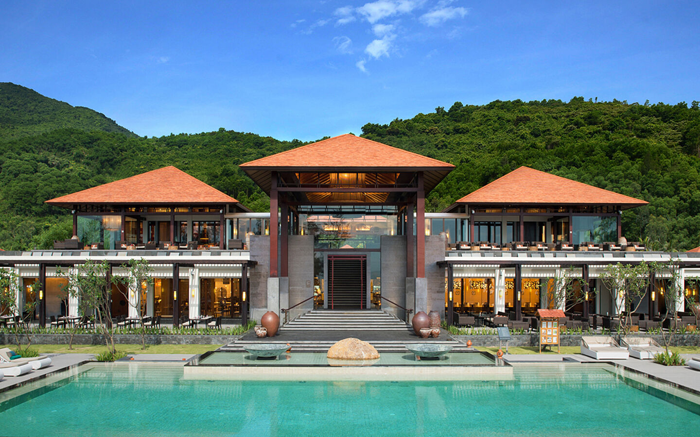 Depending on the location - with views of the lagoon and jungle or the sea - Beach Pool Villas and Lagoon Pool Villas are available. Natural materials, Champa sandstone sculptures and Vietnamese calligraphy characterize the elegant interior. The architecture is inspired by the imperial palaces of the nearby city of Hue and reflects the cultural heritage of Vietnamese dynasties.