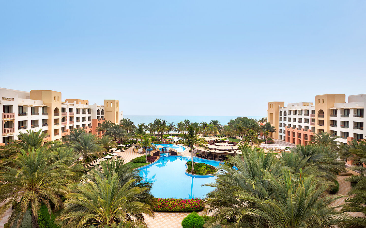 Nestled between the dramatic cliffs of Al Jissah and the Gulf of Oman , the resort ensemble combines luxurious retreats, vibrant lifestyle offerings and family-friendly concepts. Each hotel has its own signature - tailored to different travel needs.