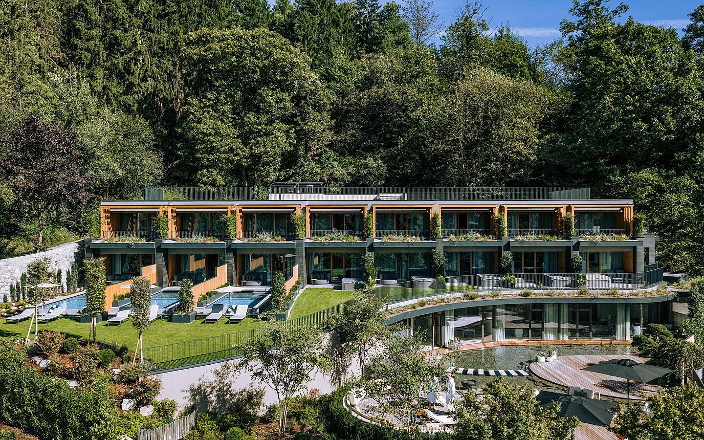 - Indoor pool with bubble loungers, year-round heated outdoor pool (32 °C), "adults only" sky infinity pool on the roof, natural bathing pond and XXL panoramic whirlpool