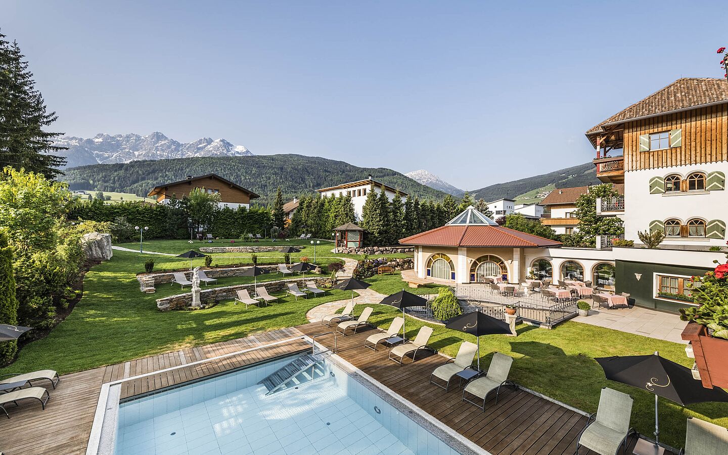 A special highlight for golf enthusiasts is the hotel’s own golf club. The 3-hole panoramic golf course, featuring a spacious driving range, putting, and chipping greens, is just a stone’s throw from the hotel—ideal for a daily round of golf against the imposing backdrop of the Dolomite peaks. The facility is available to guests free of charge and impresses with its private, relaxed atmosphere. It is ideal for beginners looking to earn their golf license as well as for experienced golfers who wish to specifically work on their technique, precision, and short game.