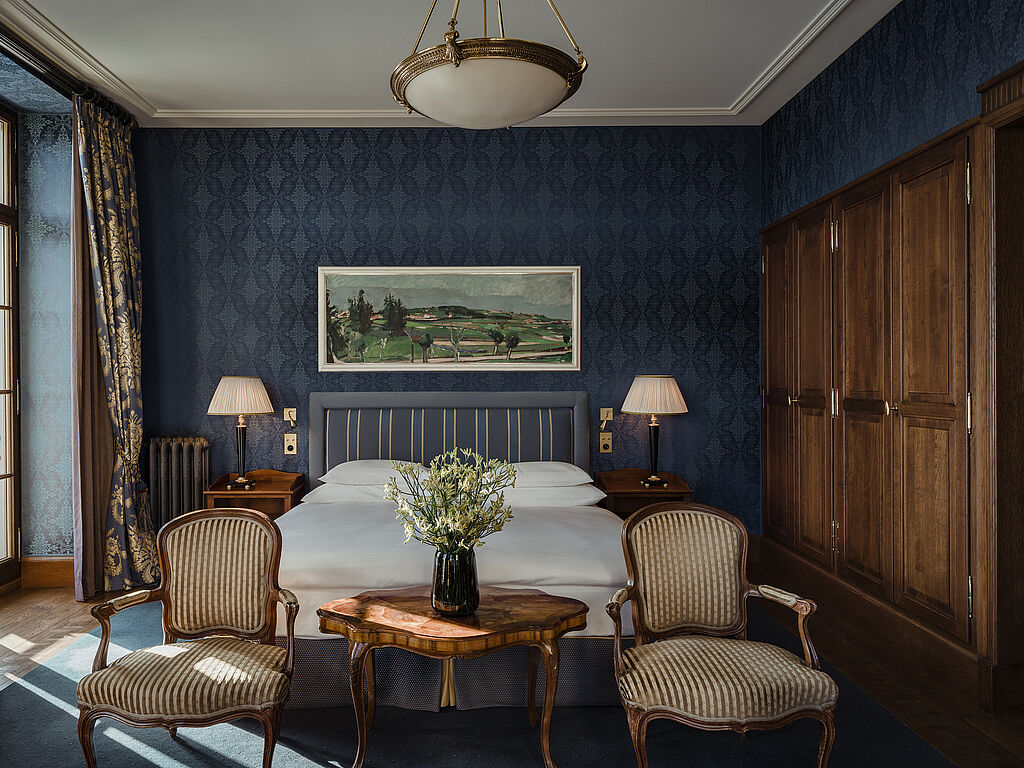 Die 82 Zimmer und Suiten im historischen Hauptgebäude am Blumenrain 8 und dem neugestalteten Kopfgebäude am Blumenrain 2 vereinen das Beste aus zwei Welten: klassisch-elegante Räume mit historischen Details treffen auf zeitgenössisches Design und atemberaubende Architektur.
