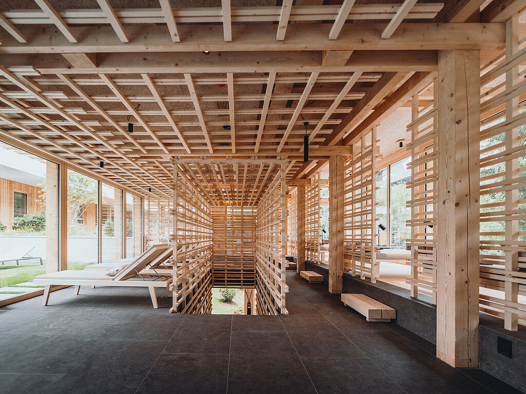 Für die Gastgeber Lea Oberhofer und Simon Leitner war das Hotel ein Herzensprojekt. Nach Wanderjahren in Paris, Mailand, Wien, Singapur und Edinburgh verwandelte das Paar den (schwieger-)elterlichen Ritterhof zu einem visionärem Wohlfühlort. Das Gebäude-Ensemble besteht überwiegend aus heimischem Holz, dazwischen lichtdurchflutete Innenhöfe, die spektakuläre Panoramen ins Haus holen.