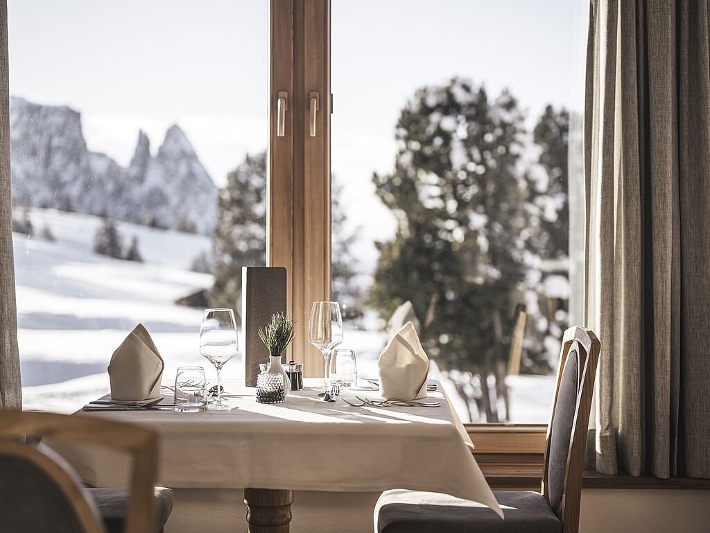 In the light-flooded dining room, culinary delights are not neglected either. Traditional South Tyrolean cuisine with a Mediterranean flair is served. A highlight are the weekly themed evenings, where guests are taken on a special culinary journey.