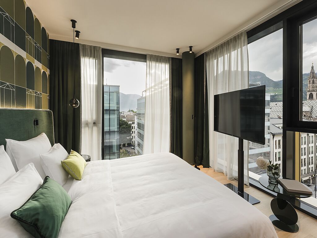 Glamor meets Alpine charm, sustainable architecture meets contemporary design, international lifestyle meets the authenticity of Bolzano. It is also an architectural statement by star architect David Chipperfield, who combines urban space, modern city life, green spaces, living and working, while respecting the Mediterranean and Alpine identity of Bolzano. Inside, the interior design by Aggi Bruch creates an elegant balance of urban chic, regional materials and warm accents.