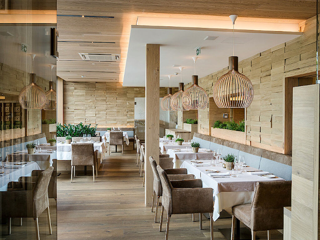 Im Genussdorf Gmachl geben natürliche Materialien den Ton an – vor allem regionales Holz aus dem eigenen Wald. Neben den vielen Holzböden in öffentlichen Bereichen sowie Zimmern wurde auch an den Decken mit Schallholzdecken gearbeitet, die neben dem Ohr auch fürs Auge angenehm sind.