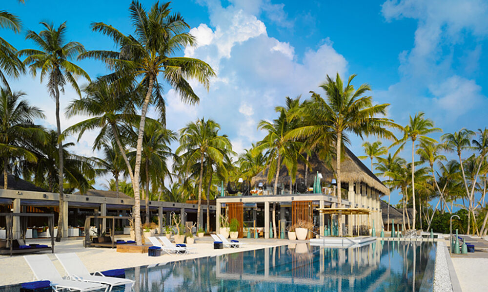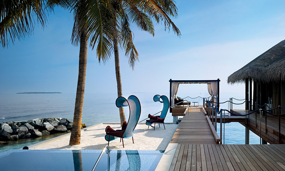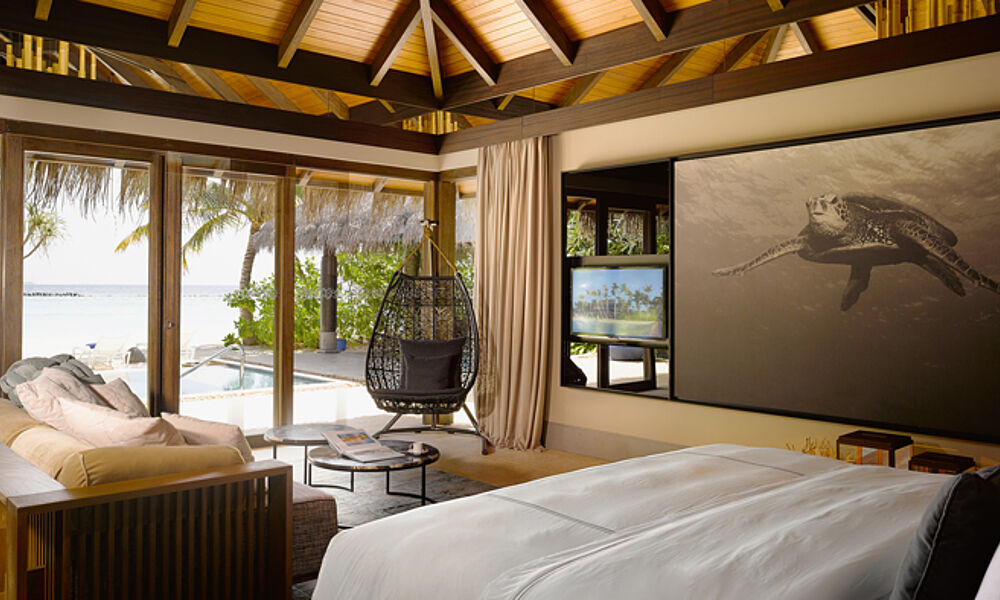 Hochpreisig, stilvoll und absolut exklusiv, mit eigenem Haus, Garten, Pool, Strand, überdachter Ruheoase und eigenem Butler – so wohnt es sich in meiner Deluxe Beach-Pool Villa. Immerhin hatten Celebrities, wie Madonna und Rihanna den gleichen Geschmack – allerdings logierten sie wahrscheinlich in der Romantic Pool Residence auf über 600qm, die nur mit dem Boot erreicht werden kann und höchste Privatsphäre garantiert. Auch gekrönte Häupter schätzen dieses Hideaway und mieten mit ihrem Gefolge gleich die ganze Insel mit ihren 43 Villen. Zur Wahl stehen ja auch noch die Sunrise Water Pool Villas draußen auf dem Meer oder die Residences für Familien auf 600 qm mit großem Pool, Küche, zwei Schlafzimmern, Fitnessraum und Bibliothek. Allen gemeinsam ist das authentische Reetdach sowie das Ambiente im Kolonialstil mit Mahagoniwänden, hohen Decken und Teakmöbel. Mit Blick auf das türkisblaue Meer genießt man das Daybed im Gazebo natürlich am besten zu zweit aber auch „ohne“ fühlt man sich im 7. Himmel.