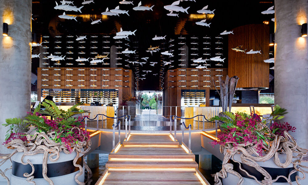 Buddy ist mein Butler und wie kann ich ihn beschäftigen, ist die Frage. So fährt er mich mit dem Golf Cart morgens zum Arthiri Restaurant, mittags zum Teppanyaki Live-Cooking in den stylischen Tavaru-Tower, der nicht größer sein durfte wie die höchste Palme und dazu noch einen gut bestückten Weinkeller beherbergt und abends dann zum Fine-Dining ins Sterne-Restaurant Aragu mit Cru Champagne Lounge. Ich verliebe mich sofort in die Currys, die Fischgerichte und in die exotischen Früchte, die mir Buddy auch ins Zimmer serviert – neben der Flasche Champagner. Ein bisschen „wie Gott in Frankreich“, kommt es mir vor.