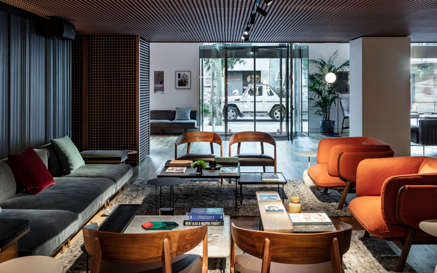 Barcelona's first design hotel - showcases the functional design of Catalan architecture firm Capella Garcia. Elements of the unusual limestone façade are teasingly drawn back like the pages of a book, allowing sunlight to flood into the 91 rooms and suites, while cleverly preserving guests' privacy at all times. The architects Baranowitz + Kronenberg were inspired by the natural region around Barcelona. The bright and spacious lobby is reminiscent of the area's curved coastline, while MR PORTER Lounge, Bar and Restaurant reflects the earthy warmth of the Monte Sant Llorenç mountain landscape. The carefully selected details, such as the dramatic copper lattice ceiling, the fine oak parquet flooring from the region or the dark walnut furniture and the eye-catching Bocci lamps, underline Sir Victor's architectural concept.