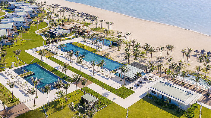 Die frühzeitige Reservierung im großartigen Le Spa zum „Reset“-Treatment direkt nach der Ankunft ist unbedingt zu empfehlen. Und was liegt näher, als anschließend über den blitzsauberen Strand ins glasklare Meer zu hüpfen? Beim Sundowner schwirrt mir ein wenig der Kopf. Wegen der Qual der Wahl in Sachen Dinner. Italienisch, japanisch, vietnamesisch oder internationales Streetfood im Foodcourt? Ich bleibe im „Altantis“ auf der Terrasse sitzen und widme mich knackfrischem Seegetier: Austern, Flower Crabs und BBQ Lobster. Fleischliebhaber dürften sich über ein saftiges BBQ Ribeye oder gegrillte Spareribs freuen. Zum krönenden Abschluss tauche ich den Löffel in Sticky Rice mit Mango. Zum Frühstück hat man die Auswahl zwischen opulentem Buffet oder à la carte mit Bedienung. Und wer wissen will, woher die Eier stammen, kann der Hühnerfarm auf dem Hotelgrundstück einen Besuch abstatten. Direkt daneben locken Kräuter- und Gewürzgarten. Alles bio.