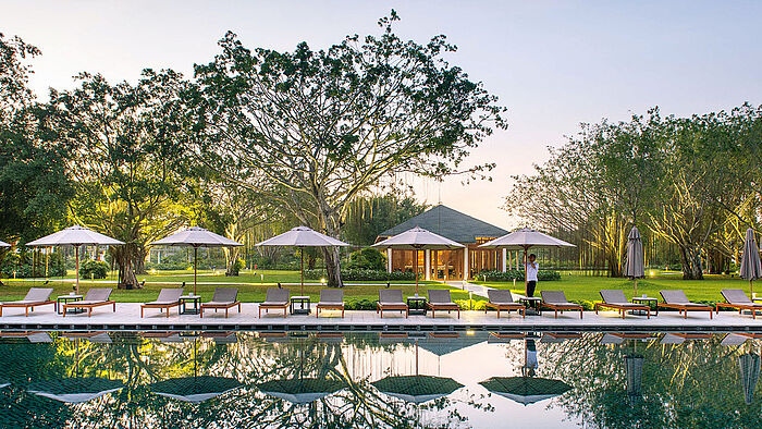 Wer in Amanresorts oder GHM-Hotels genächtigt hat, deren Ursprung ebenfalls auf Adrian Zecha zurückgeht, erkennt den puristischen Stil wieder. Vorbilder sind traditionelle, vietnamesische Dorfhäuser mit einer an drei Seiten offenen Veranda. Elegante Holzmöbel setzen Akzente im luftig-hellen Ambiente. Glastüren zur Terrasse und zum Seitenfenster wirken wie ein Rahmen ums dichte Grün. Jedes Zimmer und jede Suite besteht aus einem freistehenden Pavillon. Bäume, Buschwerk und Rasen trennen sie voneinander ab. Faszinierend ist der große Teich im Herzen der Anlage, auf dem rosa Lotus sprießt.