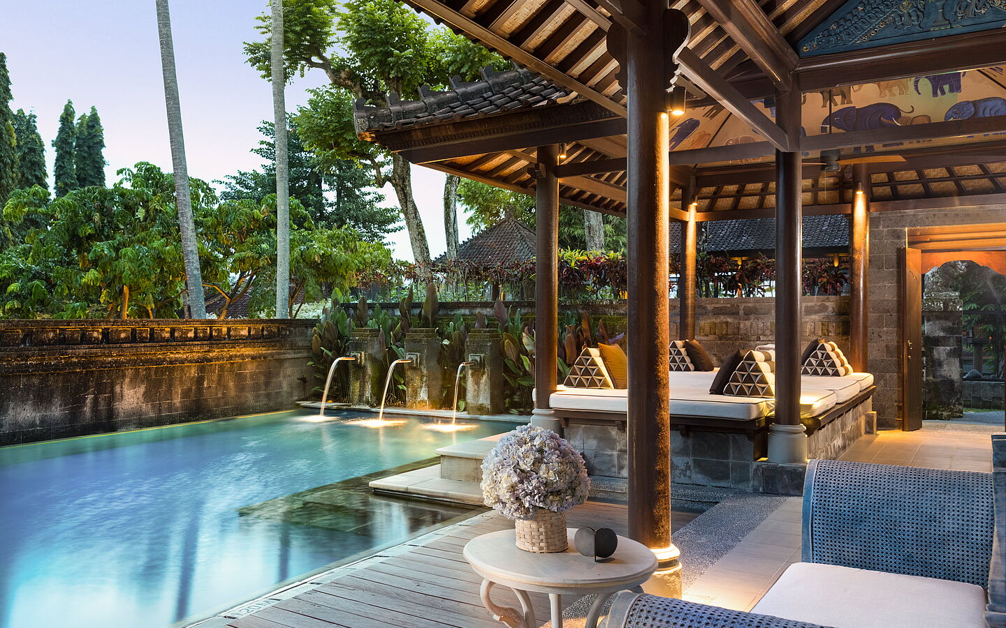 Happy Hour an der Bar? Nett, aber im Tanah Gajah begeht man die Blaue Stunde sehr viel abgehobener. Genauer gesagt, begeht man sie in einem Heißluftballon, der sich allabendlich in den Tropenhimmel erhebt. 15 Minuten dauert so ein seilgesicherter Höhenflug – gerade richtig für einen Glas Champagner und einen atemberaubenden Blick über die Reisfelder bis nach Ubud hinüber. Wer den Himmel lieber auf Erden erleben möchte, lustwandelt stattdessen durch den rund 6 Hektar großen Hotelpark mit weißen und schwarzen Schwänen, gepflegtem Grün, wucherndem Bunt sowie zahlreichen Pagoden und Pools. Ein Pflichtstopp führt zum Elephant Gate, zwei Säulen, bestehend aus 17 kunstvoll gefertigten Steinelefanten. Aber auch der elegante Panen Padi Teepavillon lohnt einen Abstecher. Gleich gegenüber befindet sich das Spa, wo zu Beginn eines zweistündigen Detox-Rituals ein Bad in Frangipaniblüten, Kokosmilch und Zitrusfrüchten auf mich wartet. Ganz so viel Hochgenuss wird im Open-Air-Restaurant The Tempayan leider nicht geboten. Auswahl, Qualität und Service sind hier zwar gut, hinter dem absoluten Ausnahme-Niveau, das in allen anderen Bereichen geboten wird, bleibt es jedoch deutlich zurück. Aber vielleicht sollte ich mich zu kulinarischen Themen auch einfach nicht mehr äußern. Schließlich hat mir die hoteleigene Handleserin ja dringend empfohlen, es mal mit einem Blumenladen oder mit Malen zu versuchen, keinesfalls jedoch mit der Eröffnung eines Restaurants! Dann schwärme ich doch lieber noch kurz von meiner 250 m2 großen Premier One Bedroom Club Pool Villa mit luftig-loftigem Charme, absoluter Privatsphäre, einem Pool, in dem man vom einen bis zum anderen Ende tatsächlich ein paar Züge braucht, und einer gut sortierten Outdoor-Bar, an der immer Happy Hour ist. Mehr zu verlangen, wäre ganz schön abgehoben …