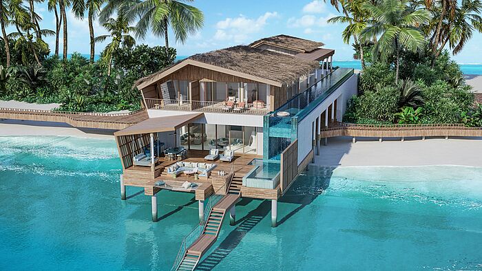 Die Präsidentenresidenz mit fünf Schlafzimmern und einem zweistöckigen Wohnzimmer dehnt sich auf 2.399 m2 aus. Die 930 m2 große Ozeanresidenz verfügt über drei Schlaf- zimmer. Mit einem privaten Bootsanleger und atemberau- benden Ausblicken von Sonnenaufgang bis Sonnenuntergang bietet Nowhere einen Fluchtort, an dem Natur und Luxus nahtlos miteinander verschmelzen – wer auf dieser Insel aktiver werden möchte, nutzt Spa und Fitness.