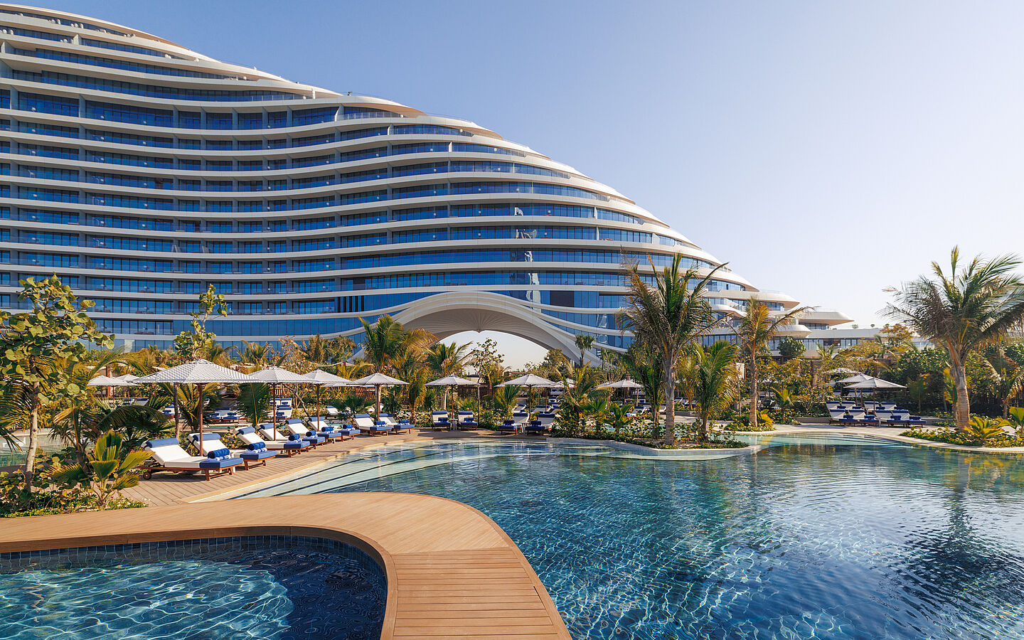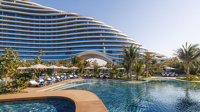 Zwischen Meer und Himmel erhebt sich das Jumeirah Marsa Al Arab wie eine Skulptur der Zukunft – ein Resort, das Dubais Küstenlinie neu definiert und den Traum vom luxuriösen Leben am Wasser in architektonische Form gießt. Entworfen von Shaun Killa, dem kreativen Kopf hinter dem Museum of the Future, gleicht das Gebäude einer eleganten Superyacht, die fest im Sand verankert liegt und doch jederzeit in die Ferne gleiten könnte. Dieses visuelle Statement ist mehr als nur Fassade: Es ist ein Versprechen für eine Reise in eine Welt, in der maritime Leichtigkeit, orientalische Gastfreundschaft und internationaler Lifestyle miteinander verschmelzen. 300 Zimmer und 86 Suiten, alle mit privaten Terrassen und unvergleichlichem Blick auf den Arabischen Golf, eröffnen einen Panoramagenuss, der den Horizont zum Teil des eigenen Rückzugs macht. Die Architektur lädt ein, den Tag im Flüstern der Wellen zu beginnen und ihn bei Sonnenuntergang über der Skyline von Dubai zu vollenden. Ergänzt wird das Ensemble durch 82 Residenzen und eine hochmoderne Marina mit 82 Liegeplätzen, die Superyachten aus aller Welt willkommen heißt – ein Treffpunkt für Liebhaber des maritimen Lebensstils.Wer hier verweilt, entdeckt mehr als nur ein Hotel: Es ist ein lebendiger Mikrokosmos voller Aromen, Klänge und Emotionen. Elf Restaurants und vier Bars bieten eine kulinarische Weltreise, die von japanischer Präzision über mediterrane Eleganz bis hin zu kalifornischer Leichtigkeit reicht. Das Rialto Restaurant & Bar etwa zelebriert italienische Lebensfreude mit hausgemachter Trüffelpasta und cremigem Tiramisu, serviert unter freiem Himmel oder indoor. Zu einem Glas Champagner zwischen roséfarbenem und grünem Marmor verführt die anschließende Bar. Am Iliana Beachclub verbindet sich mediterranes Flair mit unbeschwerten Strandtagen – begleitet vom spektakulären Blick auf das Burj Al Arab. Und wer den Tag in stiller Eleganz ausklingen lassen möchte, findet am Kinugawa-Adults-only-Pool seine Oase, mit Sushi und Asian Fusion in privater Atmosphäre, umgeben von Daybeds und üppigem Grün.