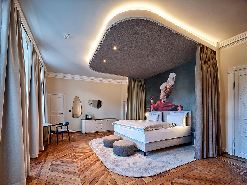 Die elf individuell gestalteten Zimmer und Suiten vereinen historische Elemente wie Stuckdecken und originale Parkettböden mit edlem Interieur von Marken wie Dôme Deco, Polspotten, Paul Lindberg und Musterring. Maßgefertigte Möbel der Saarburger Traditionsschreinerei Meier verleihen jedem Raum eine eigene Handschrift. Großzügige Fenster öffnen den Blick auf die Saar und die gegenüberliegende Burg, während Designakzente wie der filigrane Kriskadecor-Kettenvorhang über dem Chef’s Table im Restaurant Dopamin Fine Dining markante Akzente setzen.