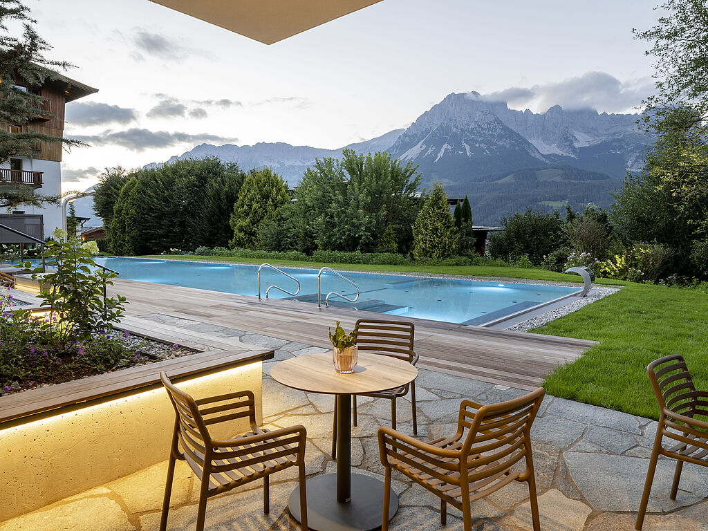 Nach einem aktiven Tag schöpft man im Badehaus samt abwechslungsreicher Saunalandschaft und ganzjährig beheiztem Infinity-Pool neue Energie. Seit Sommer 2022 dürfen sich Gäste zudem über einen neuen 30 Meter langen und sieben Meter breiten Außenpool freuen, der aussichtsreiche Schwimmbahnen mit Blick auf den Wilden Kaiser verspricht.