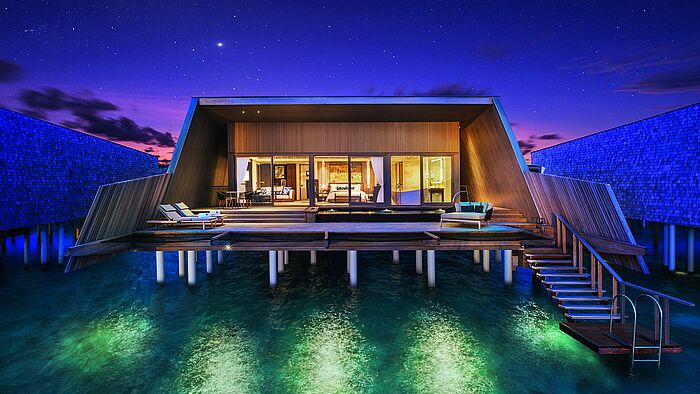 Die ersten Sonnenstrahlen leuchten über dem Indischen Ozean , während man, umgeben von bunten Fischen, durch die Lagune schnorchelt. Zurück in der Villa eröffnet sich auf der privaten Terrasse, mit einer Tasse Kaffee in der Hand, der Blick über das endlose Blau. Am Nachmittag folgt eine Yoga-Session, anschließend eine Massage. Und zur späteren Stunde? Ein Dinner unter dem tropischen Sternenhimmel. Was wie ein Traum klingt, wird im St. Regis Maldives Vommuli Resort zur Wirklichkeit. Die 77 Villen verbinden den Charme der Natur mit modernstem Komfort. Das John Jacob Astor Estate – die größte Overwater-Villa der Malediven – besticht mit drei Schlafzimmern, Fitnessstudio, Spa-Bereich und endlosem Meerblick. Das Caroline Astor Estate empfängt bis zu sieben Gäste mit 67 m2 Poolfläche, während die Cesar Balsa Villa und die Sunset Overwater Villen diskreten Rückzug mit spektakulären Aussichten versprechen. Kulinarik wird zelebriert: mediterrane Leichtigkeit im