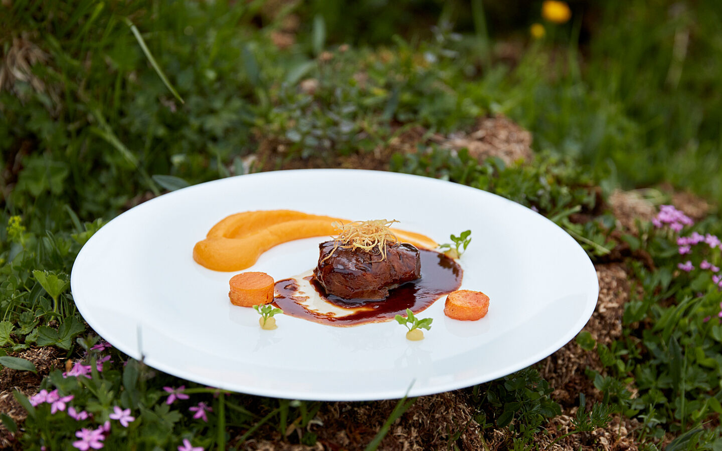Unter dem Motto: «Experimentieren ja, aber die Identität und der Geschmack der Produkte sollen dabei stets erhalten bleiben», inszenieren Tristan Brandt und sein Team im OPUS V in Mannheim eine anspruchsvolle Gourmetküche. Und das zeitgemäss, ohne modischen Schnickschnack. Die Basis seiner kreativen und authentischen Küche bilden regionale und saisonale Produkte, die mit nationalen und internationalen Zutaten gekonnt ergänzt werden. Dabei setzt das OPUS V Team auf ein vertrauensvolles Verhältnis zu ihren Partnern, Lieferanten, Bauern, Winzern, Züchtern, Pâtissiers, Bäckern und Käseerzeugern. Im Dezember 2016 wurde das OPUS V mit dem zweiten Michelin-Stern ausgezeichnet. Sein Gericht für die Heidelberger Hütte: Kalbsbäckchen / Süsskartoffel / Ingwer.