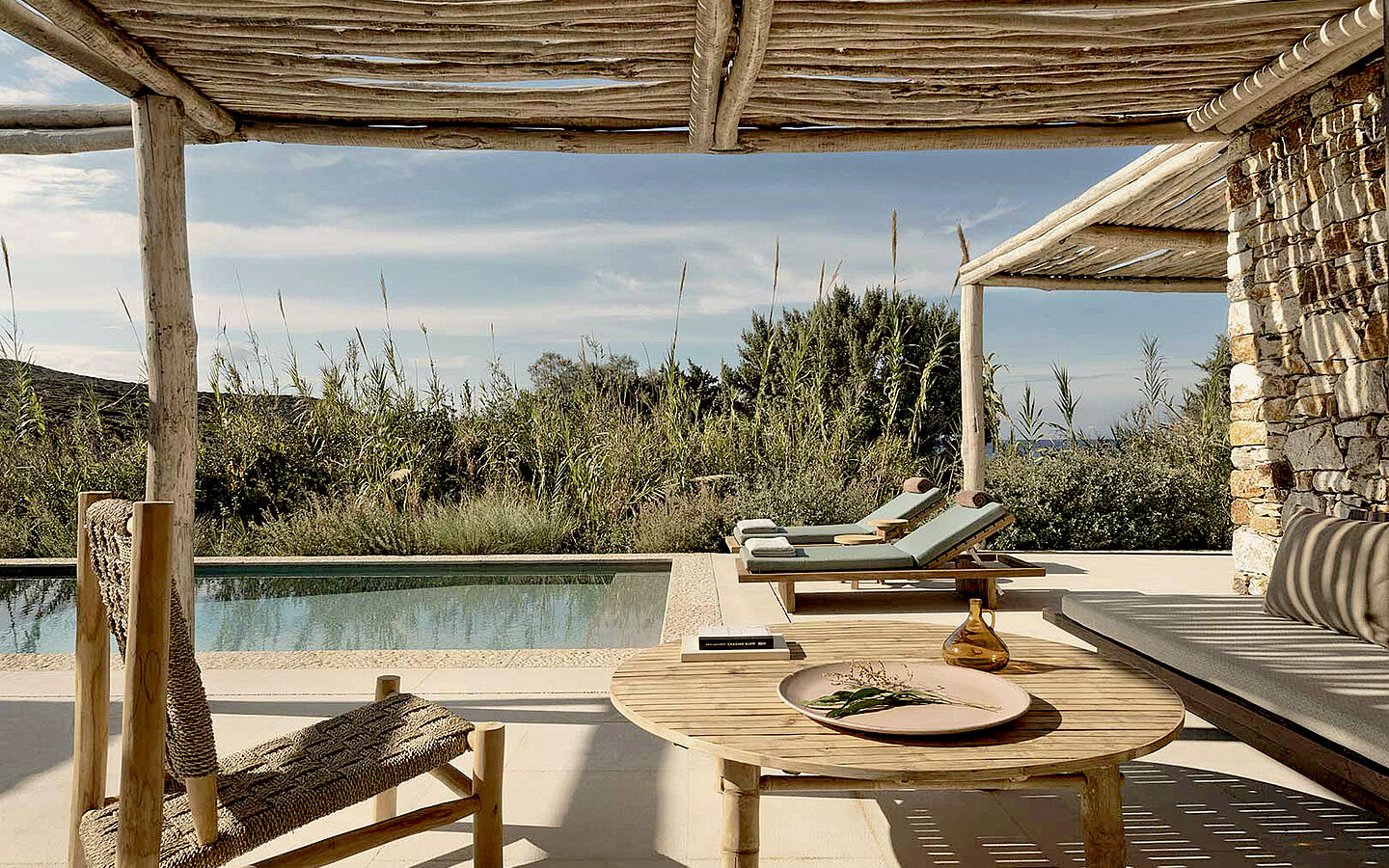 Mit gerade einmal 17 Suiten und Villen – die meisten davon mit privaten Pools ausgestattet – passt die Anlage im Look eines leger-luxuriösen Boutique-Hotels perfekt zum Lifestyle von Antiparos. Und auch das kulinarische Angebot präsentiert sich konsequent lokal: Alles, was im „The Restaurant“ auf die Tische kommt, stammt entweder vom eigenen Bio-Bauernhof oder ist morgens noch im Meer geschwommen. Abgerundet wird das ebenso nachhaltige wie ganzheitliche Angebot im hippen Haus mit dem Hahn im Namen durch einen lauschigen Spa-Bereich mit strohgedecktem Patio.