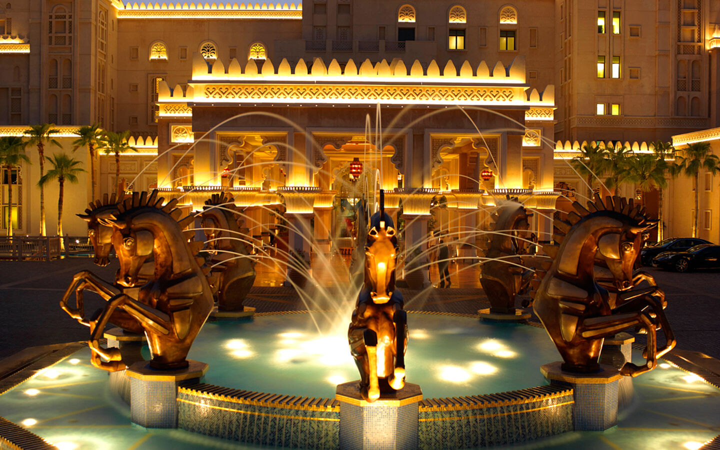 führt an prächtigen Statuen arabischer Hengste vorbei zum Hotel, dessen Anblick wahrhaft atemberaubend ist. Das Jumeirah Al Qasr ist der Inbegriff alter arabischer Baukunst, eine unvergleichliche Oase des Luxus.Der ideale Ort, um zu entspannen, Neues zu erleben und seine Aufmerksamkeit auf die schönen Seiten des Lebens zu lenken.