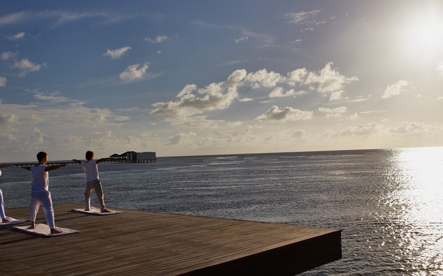 Bei The Residence Maldives sorgt eine Yoga Healthy Hour für innere Ruhe und Balance. Auf dem am Ende eines langen Holzsteges gelegenen Yoga-