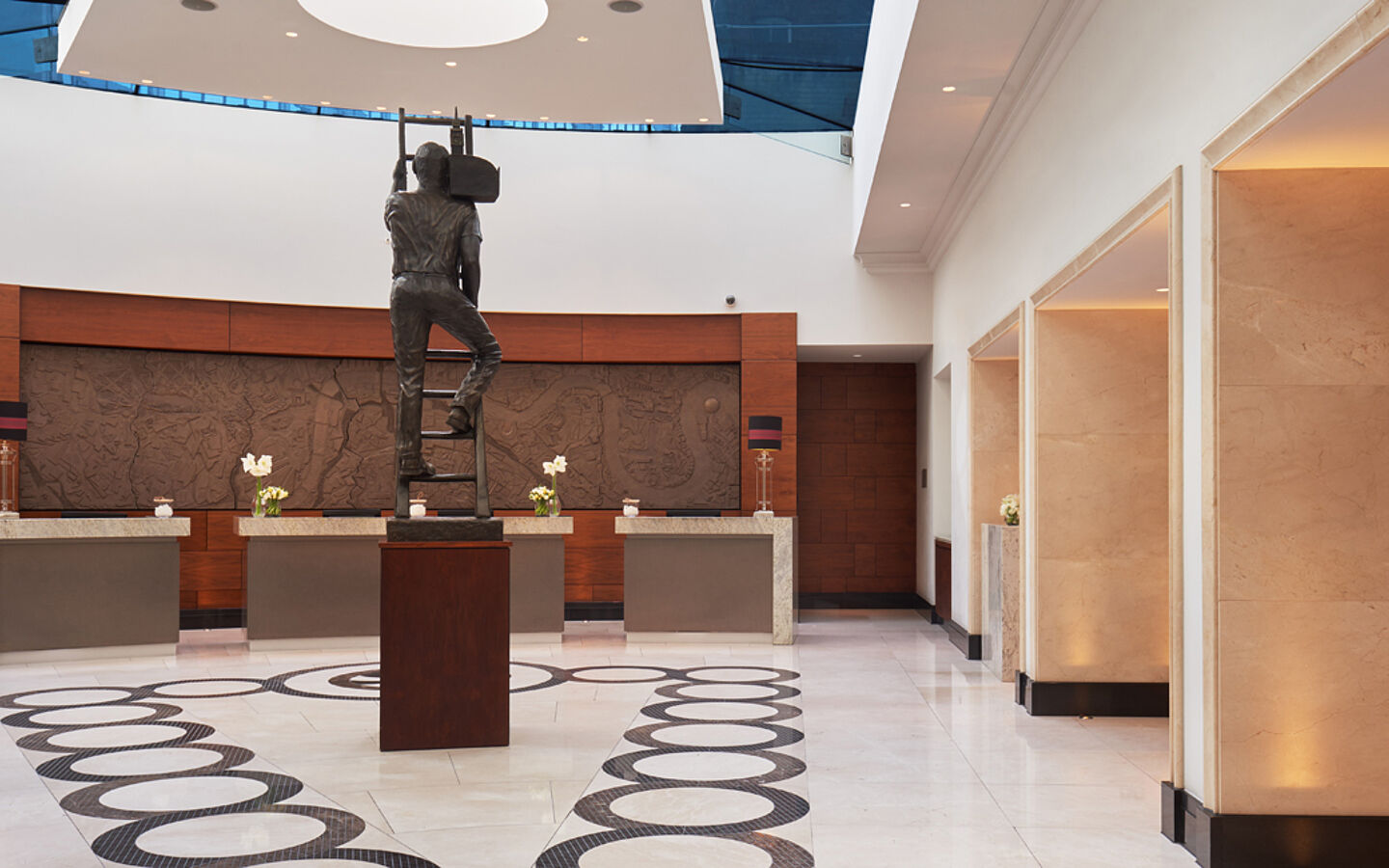 Die 1 A-Adresse 22-28 Brodway, London SW1H lässt schon vermuten: das Conrad St. James hat für kosmopolitische City-Tripper einiges an Hauptstadt-Flair zu bieten. Das beginnt schon in der Lobby, die von einem Skulptur-Werk enormen Ausmaßes beherrscht wird. Tatsächlich steigt eine bronzene Figur in Lebensgröße mittendrin eine Leiter hinauf: „The Ladder“ vom Künstler Tom Clark vermittelt schon beim Ankommen: hier gibt’s politische Ansagen. Nebenan, kurz vor der Emmeline Bar & Lounge begrüßt das Kunstwerk „The House Always Wins” von Evil Roberts – eine Skulptur, die das House of Parliament aufs Korn nimmt.