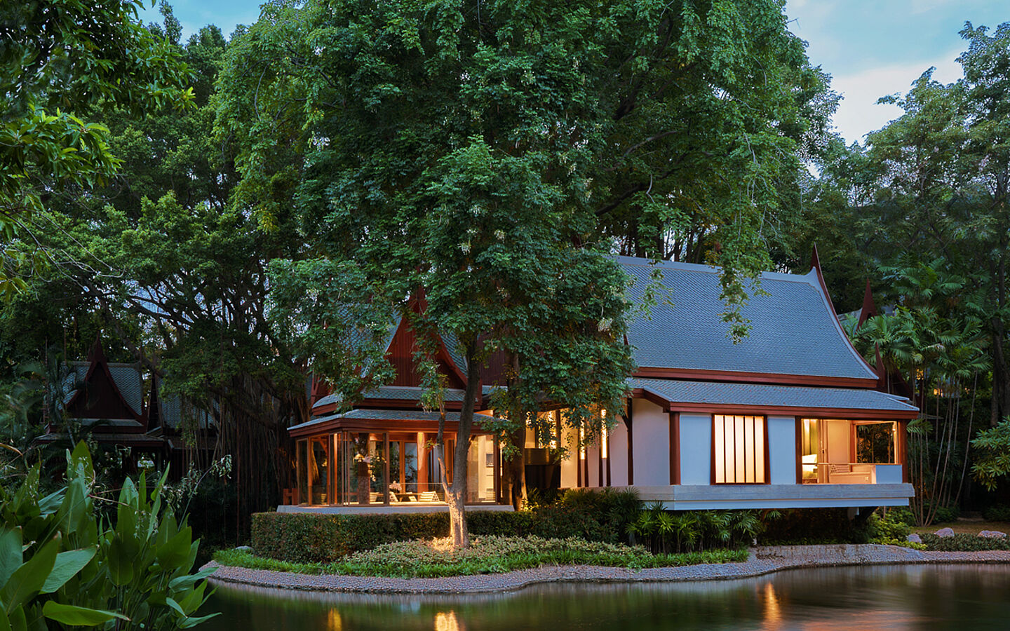 ist ein Sala – ein kleiner, privater Raum, der einen fließenden Übergang zwischen innen und außen darstellt. Gäste können hier entweder privat essen, entspannen oder auch ihre Yoga- und Meditationsstunden abhalten. Das Grün des Interiordesigns lässt dabei die Grenzen zwischen Raum und Natur gänzlich verschmelzen. Das Raumgefühl zu verändern war eines der größten Anliegen bei der Renovierung der Thai Pavilions, deren Gestaltung weitläufiger und großzügiger wurde, dem Lebensgefühl und dem Wunsch nach mehr Privatsphäre angepasst.
