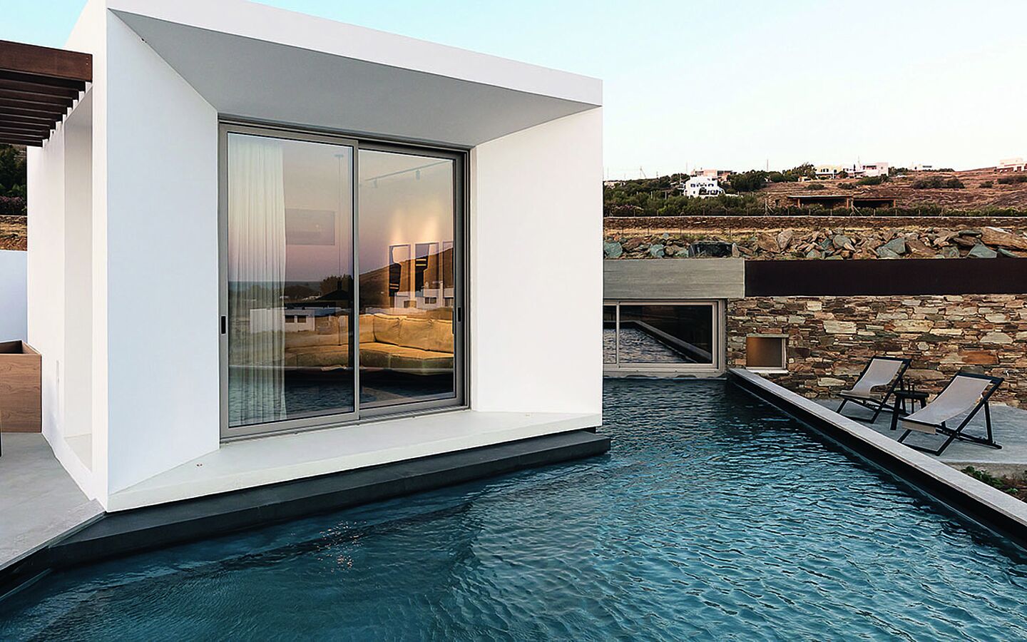 fügen sie sich trotz ihrer auf strahlend-weiße Kuben reduzierten Grundformen harmonisch in die Landschaft ein. Und auch die puristischen Interiors mit heimischen Hölzern, sorgfältig kuratiertem Kunsthandwerk und glatt polierten Lehmwänden stehen im Dialog mit Land, Landschaft und Leuten. All das macht Pnoes Tinos zu luxuriösen Retreats, wie sie sich im Mittelmeerraum nur selten finden lassen.