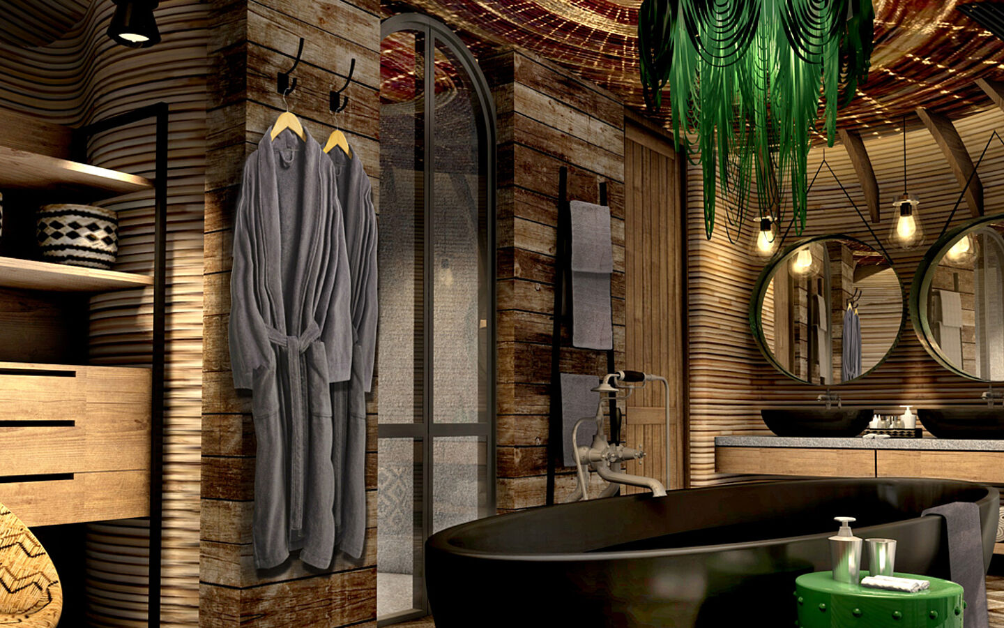 Leuchtendes Smaragdgrün schimmert in Stoffen und Kronleuchtern, die kugelförmigen Strohdächer der Villen sind eine Hommage an die hügelige Landschaft Ruandas, schwarz-weißes Rinderleder soll das Landleben symbolisieren. Auf vielen Möbeln ist das „Imigongo“-Muster zu finden, eine alte und landestypische Kunstform. Das Lebensgefühl der Einheimischen hat in das Design der Bisate Lodge des Ökosafariunternehmens Wilderness Safaris Einzug gehalten, und die Architektur ist gar königlich. Die sechs geräumigen Villen sind dem ruandischen Königspalast nachempfunden, liegen auf dem steilen Hang eines erodierten Vulkankegels und sind zudem umgeben von Artenvielfalt und atemberaubender Landschaft. Ab Juni empfängt die majestätische Lodge ihre Gäste.