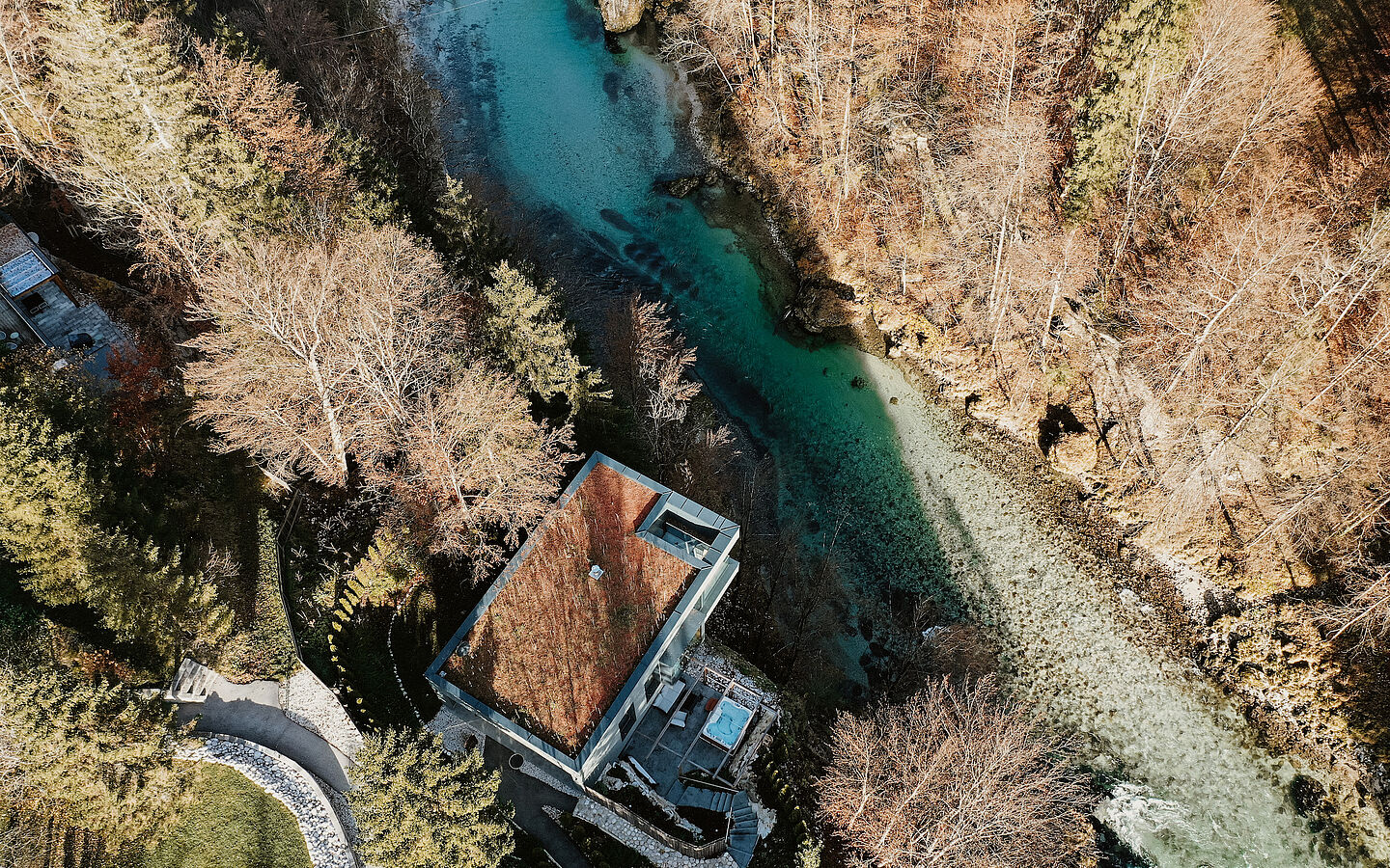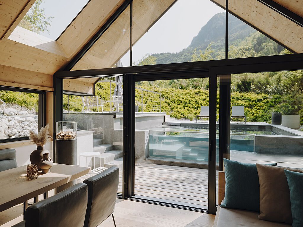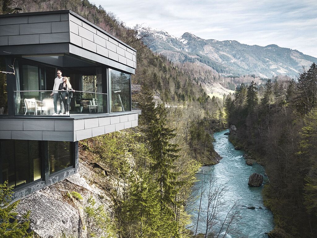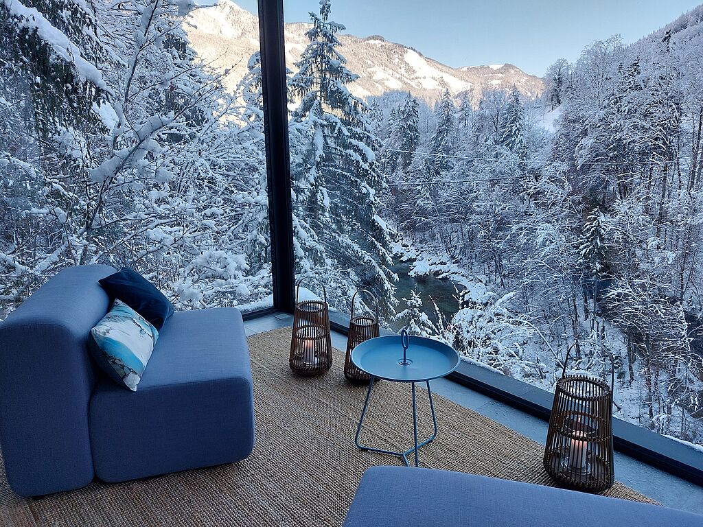 In den Chalets fällt sofort die große Liebe zum Detail auf: Im Haus „Wasser“ funkeln verschiedene Blautöne, passend zur darunter sprudelnden Salza, Interieur-Details in warmen Rotnuancen spiegeln das Haus „Feuer“ wider. Viel Holz und Naturmaterialien kreieren eine Wohlfühlatmosphäre in allen Häusern. Das Design ist modern, aber nicht zu clean. Jedes Detail ist durchdacht. So wichtig das „Innen“ auch ist, das Panorama steht immer im Fokus. Jedes der Chalets bietet viele verschiedene Sitzmöglichkeiten, um die Umgebung zu genießen und die Ruhe der Natur auf sich wirken zu lassen. Ein kuschliger Lieblingsplatz im Winter: die vor den großen Fenstern platzierten Sessel, auf denen Erholungssuchende eine Tasse Tee mit Wow-Ausblick genießen können. Im Sommer zieht es die Gäste auf die über dem Fluss schwebende Terrasse. Und wenn die Sonne auf die Nasenspitze scheint, die Vögel zwitschern und die Salza in der Tiefe rauscht, dann scheint der Alltag ganz weit weg. Einzig und allein auf der To Do Liste: Entschleunigen und neue Kraft tanken.