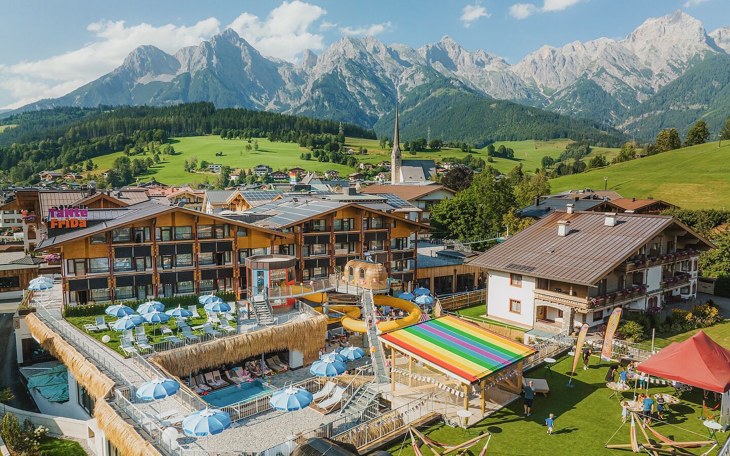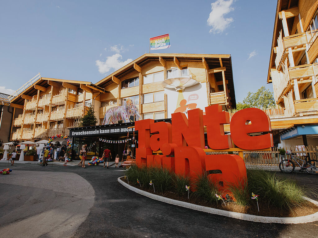 Und für Abenteuer findet sich reichlich Gelegenheit im TaNte FriDa: In der nagelneuen Garten-Welt bieten Flying Fox, Baumhaus, Hängebrücke, Gokart-Bahn, Brunnen und Außenpool alles, was man zum Austoben so braucht. Die Spiel-Welt wartet mit täglich 2 Stunden Kinderbetreuung und abwechslungsreichem Aktiv-Programm (Malen, Schnitzen, Backen, Turnen, Kegeln etc.) auf. In der 1.000 m² großen Wasser-Welt mit 80 Meter langer Erlebnisrutsche kommen Wasserratten auch an Schlechtwettertagen auf ihre Kosten. Dazu kommen, Kletterhütten, ein Fitnessraum, ein Game Room, ein hauseigenes Theater mit Kino-Leinwand und zwischendrin immer wieder Rückzugsorte und Ruhezonen zum Runterkommen.