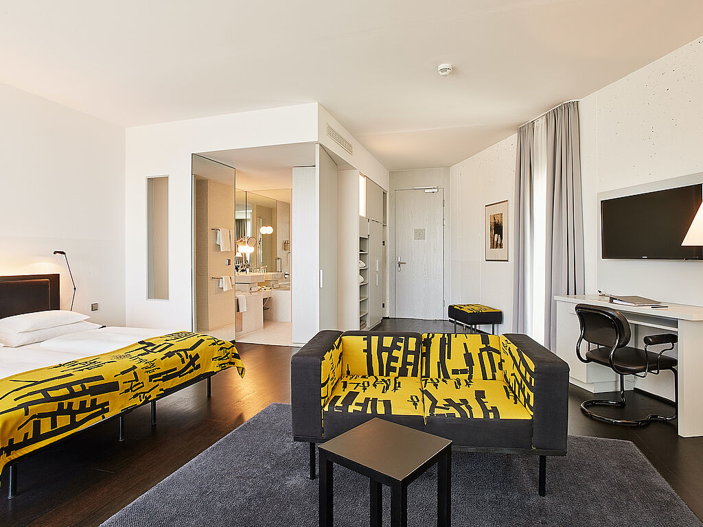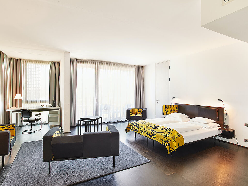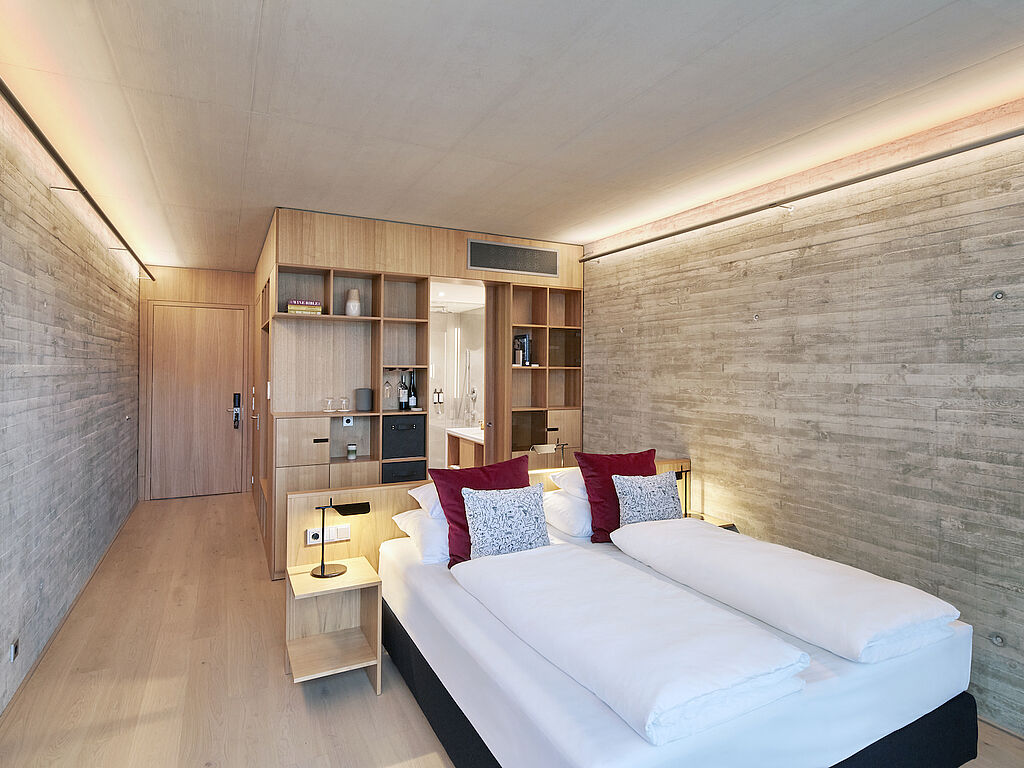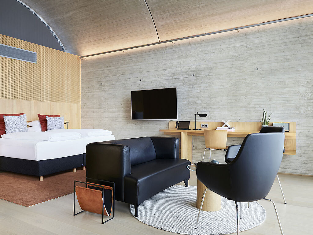 Es sind vor allem die zahlreichen Weinsymboliken, die sich in Architektur, Einrichtung und Stimmung offenbaren. Eines von Holls zentralen Weinelementen: Die Korkstruktur am Stiegengeländer und auf den Lampen. Auch die hinterleuchteten Zimmertüren erinnern an das Kellerlabyrinth. Das Gewölbe wird übrigens auch auf den gelb-schwarzen Stoffen zitiert, die man in allen 112 Zimmern im Haupthaus, das "GrüVe House", wiederfindet. Der gestreifte Sichtbeton auf den Gängen wiederum steht für die Weingartenzeilen. Kurz gesagt: Wein soweit das Auge reicht. Trotz der großen Kubatur herrscht im gesamten Komplex totale Transparenz. Schon in der Lobby offenbart sich dem Gast solcherart ein atemberaubender Blick über die Weingärten. So wird die Landschaft ins Innere gezogen – und die Hotelräume scheinen bis zu den Weingärten zu reichen. Der im Sommer 2021 eröffnete Erweiterungsbau, das "Pinot House" durch 26 Zimmern, vier Suiten und einem Konferenzzentrum bildet westlich des Hauptgebäudes den letzten Baustein des vor nunmehr 20 Jahren entwickelten Gesamtkonzepts.
