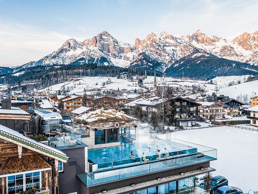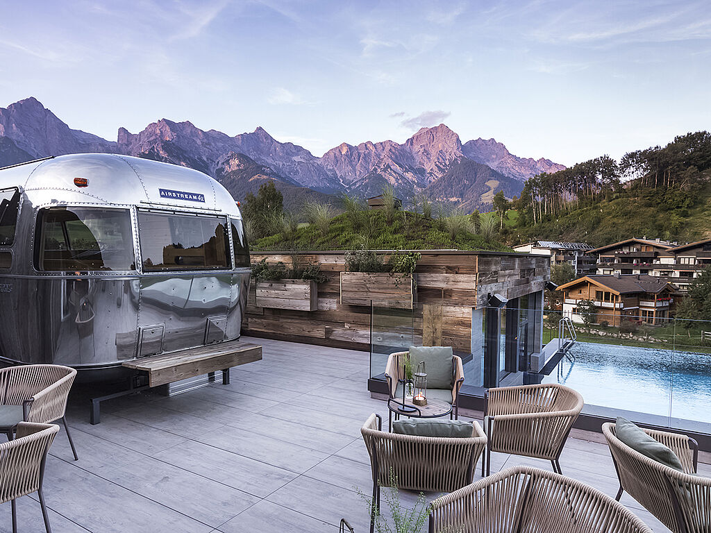 Auch das Wohlfühlprogramm findet auf dem Roof Top statt. Ein eigens dafür umgebauter Airstream und zwei kleine Sauna-Kabinen laden zum Relaxen ein. Im 12 Meter langen Pool schwimmt es sich herrlich mit Blick auf das Steinerne Meer. Einen Entspannungsort findet man auch im Atrium unter den Bäumen. Die Meindl Lounge ist ein Lieblingsplatz zum gemeinsamen Chillen. Bei entspannenden Massagen kann man sich im stilvollen Ambiente verwöhnen und den exSEPPtional Spirit des Hauses auf sich wirken lassen. Der Ritzensee ist in etwa 8 Minuten Fahrtzeit mit dem Auto erreichbar, Zell am See in guten 20 Minuten, der Speicherteich am Hausberg Natrun in Maria Alm in knappen 15 Minuten per Gondel und kleinem Fußweg.