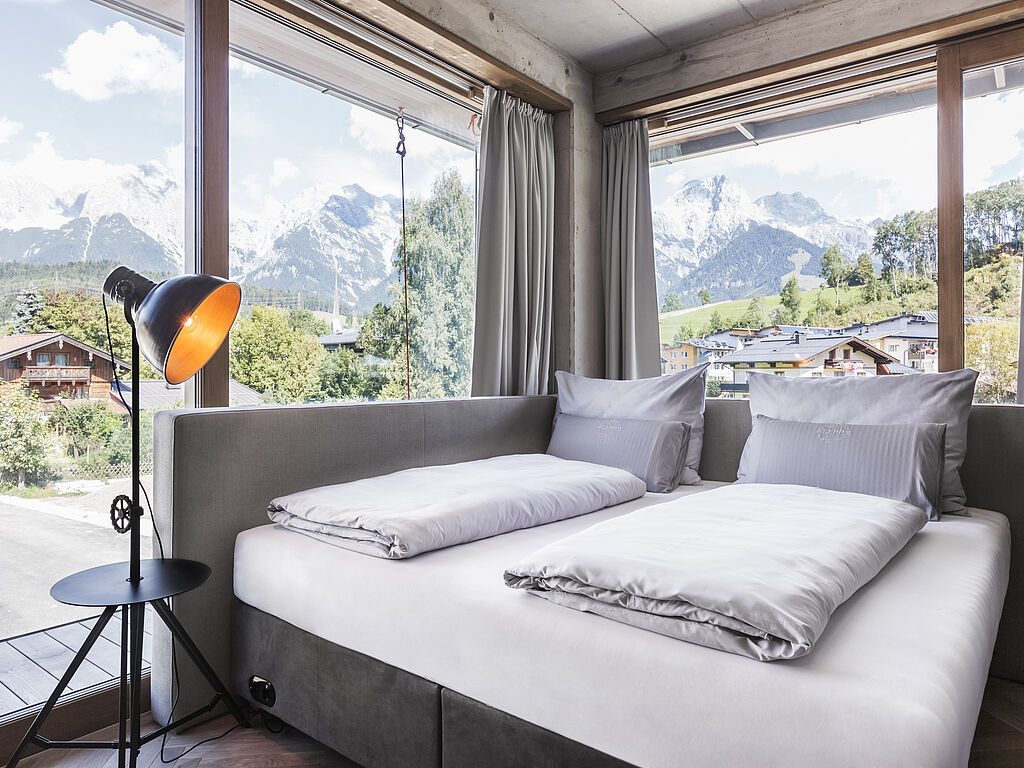Jedes auf seine Art exSEPPtional: Die Zimmer (22 – 38 m²) sind in fünf Zimmertypen aufgeteilt und haben alle ihren ganz eigenen Stil. Im Cosy sorgen beispielsweise urige Altholzwände, ein massiver Holzboden, ein kuscheliges Doppelbett, eine breite Fensterbank mit Hochkönig-Blick und eine eigene Fernsehleinwand für Gemütlichkeit. Das Luxury wiederum punktet mit modernem Design-Ambiente, freistehender Badewanne und Balkon mit Hutschn-Schaukel.