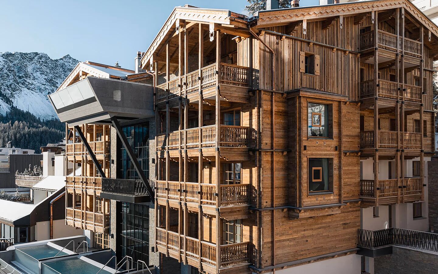 Das BelArosa Chalet besticht durch architektonische Highlights wie die fünf Skypools, die sich auf Knopfdruck mit 36 Grad warmem Wasser füllen, und die Fassaden aus 200-jährigen, handgehackten, sonnenverbrannten Balken, Schalungen und Eckverbindungen aus Fichte und Lärche. Diese alten Materialien sind nicht nur nachhaltig, sondern sorgen in Verbindung mit Stahl für eine hohe Schneelasttragfähigkeit und bleiben der Bündner Bautradition treu.